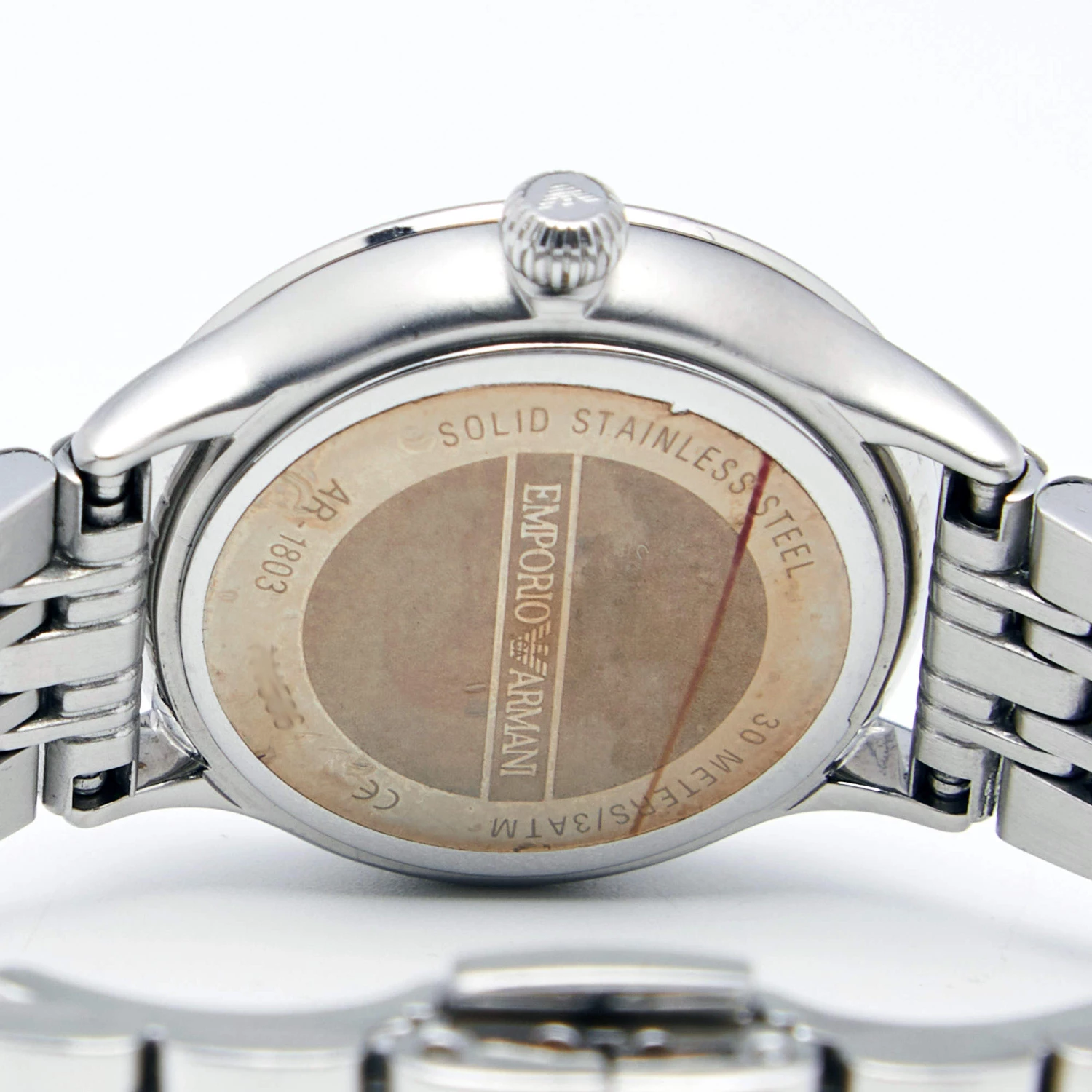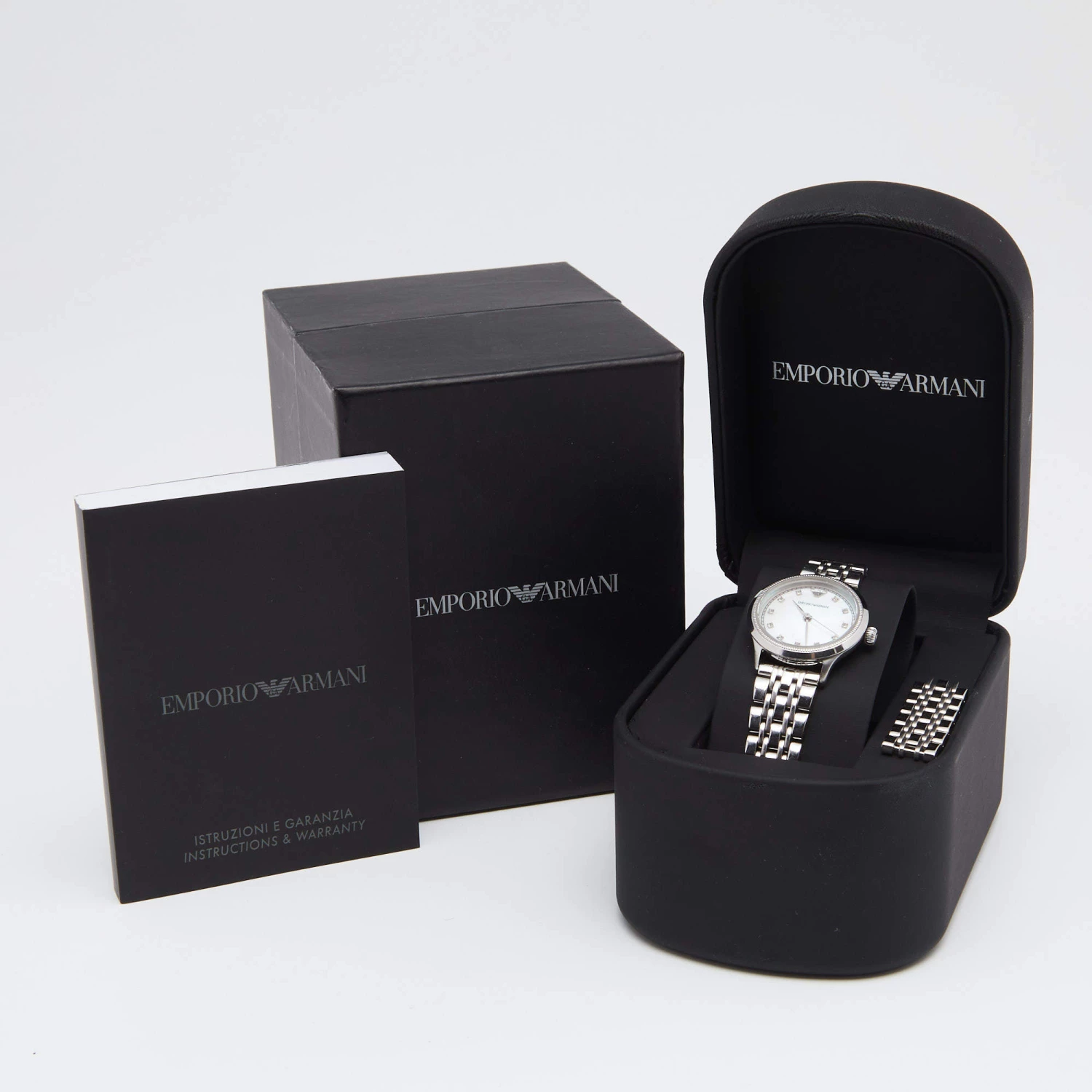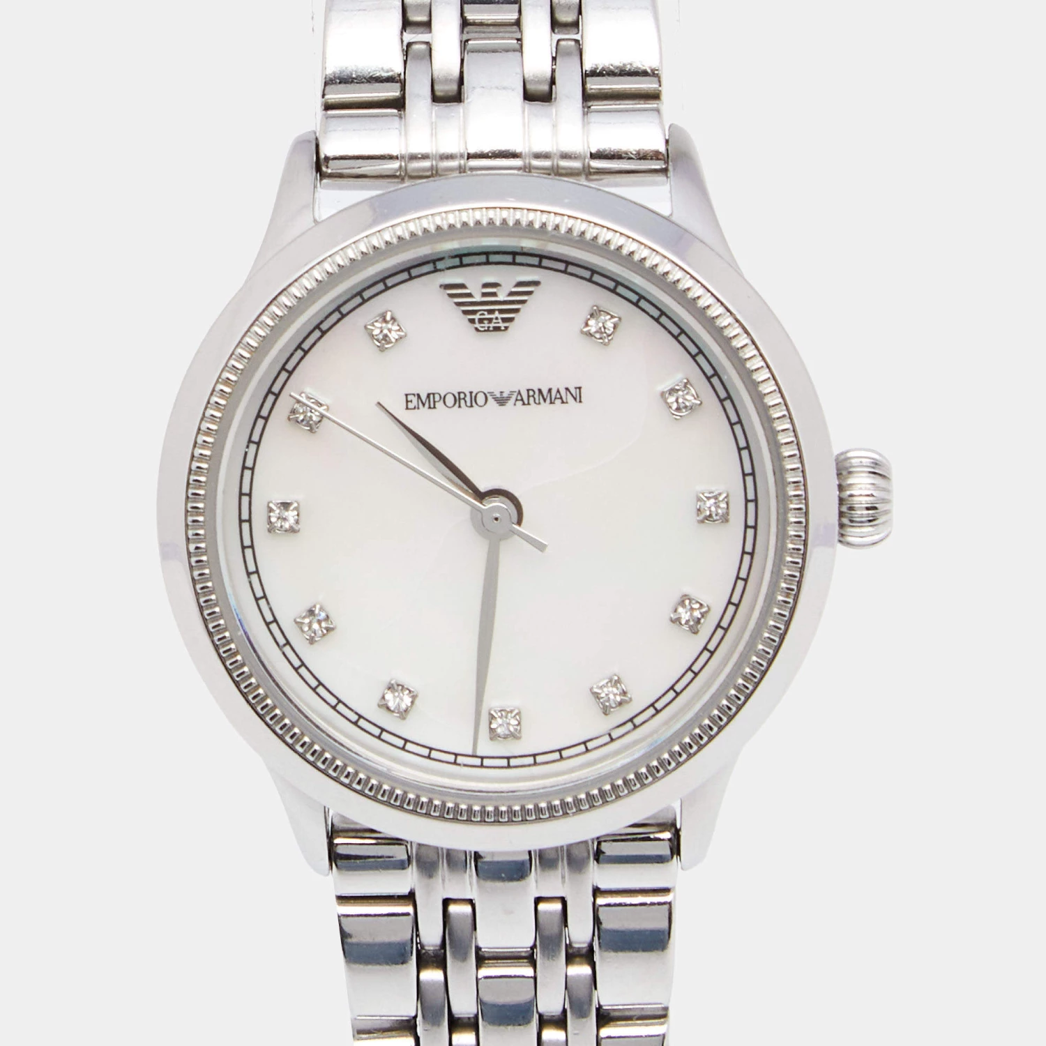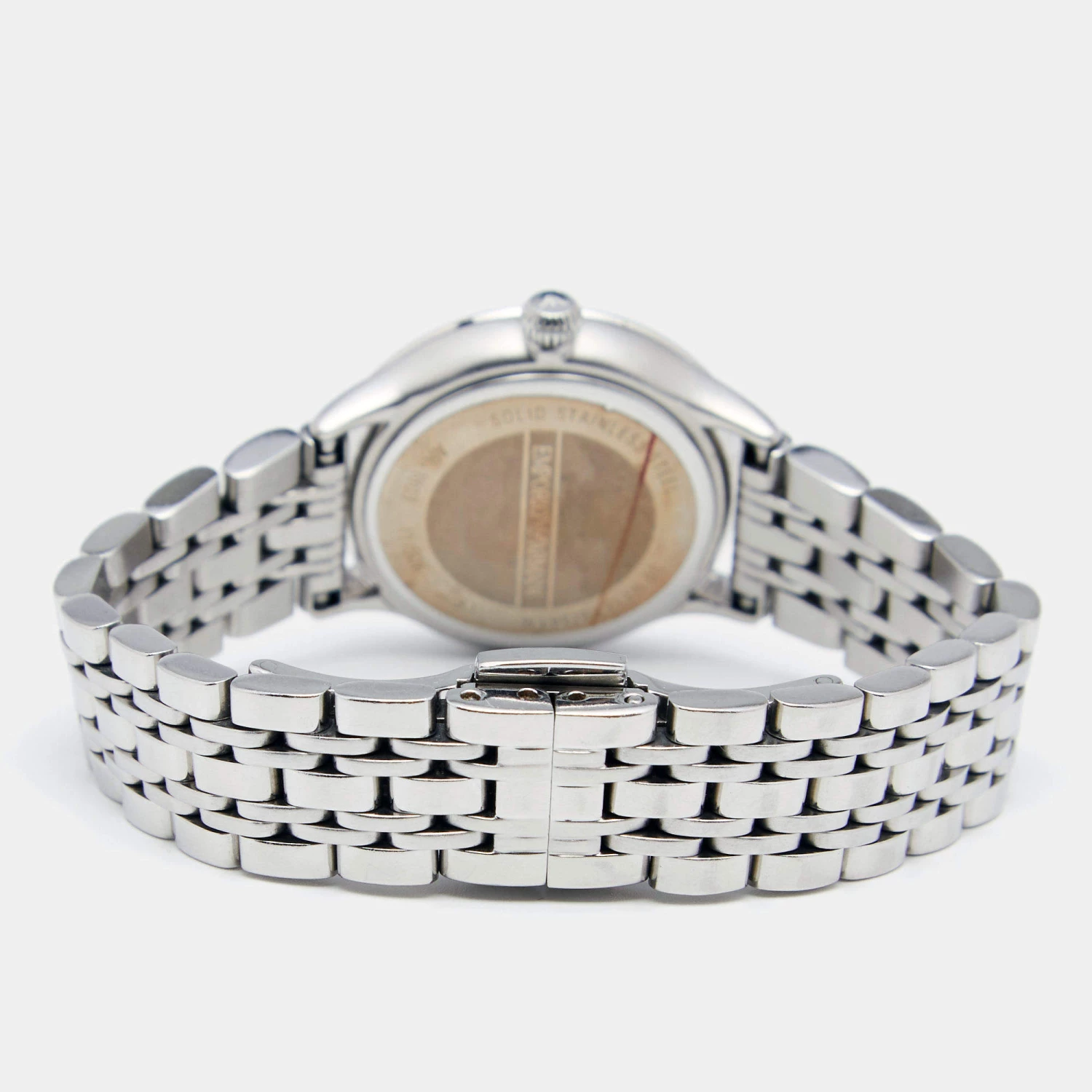 This wristwatch from Emporio Armani is a picture of elegance. Created from stainless steel, this quartz watch has a round case, a Mother of Pearl dial, and a comfortable chain-link bracelet. It is water-resistant up to 30 meters and is equipped with a push-button closure.