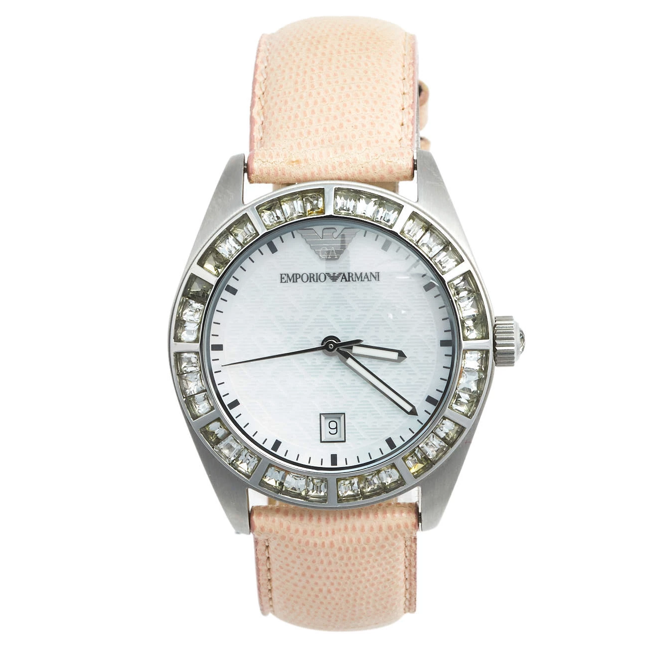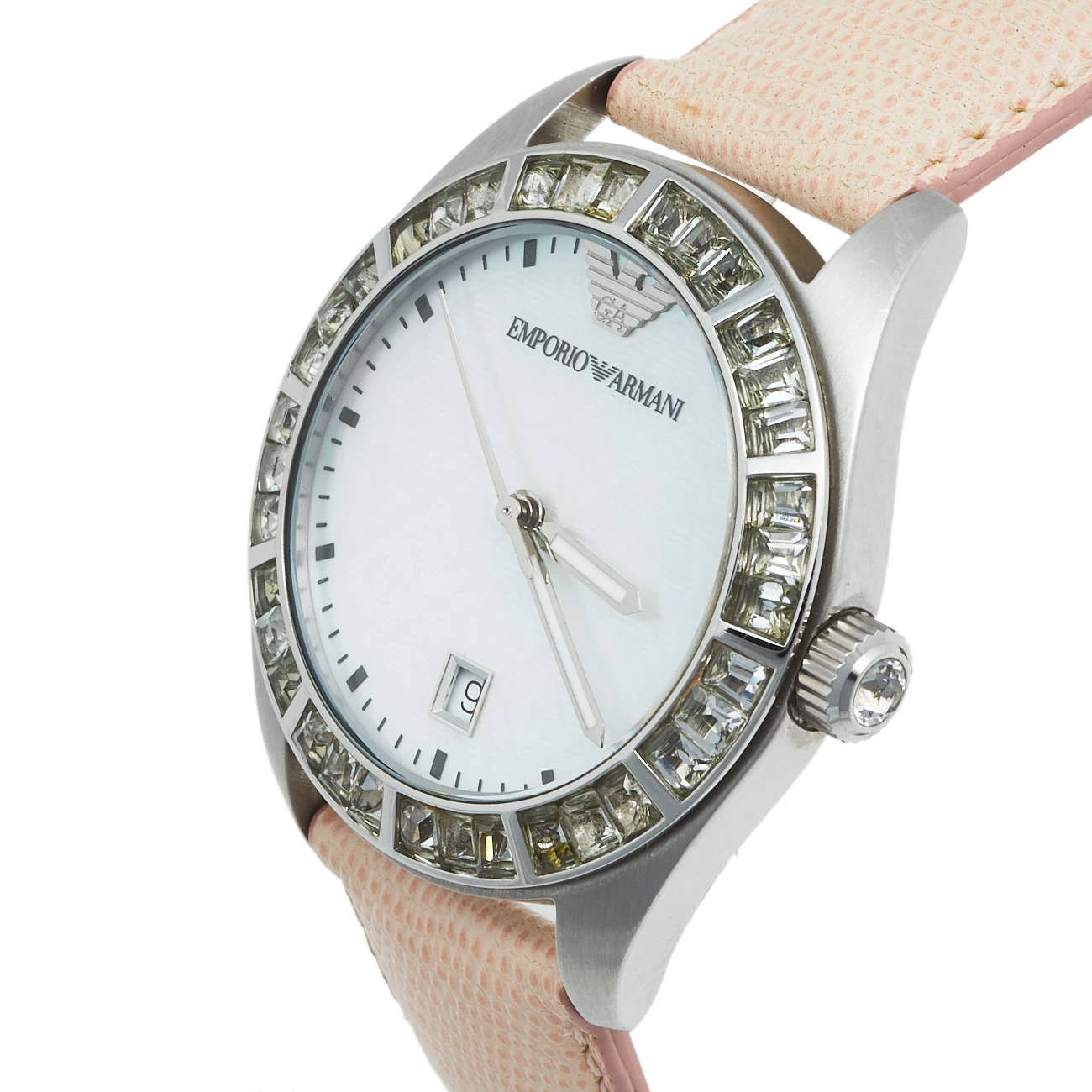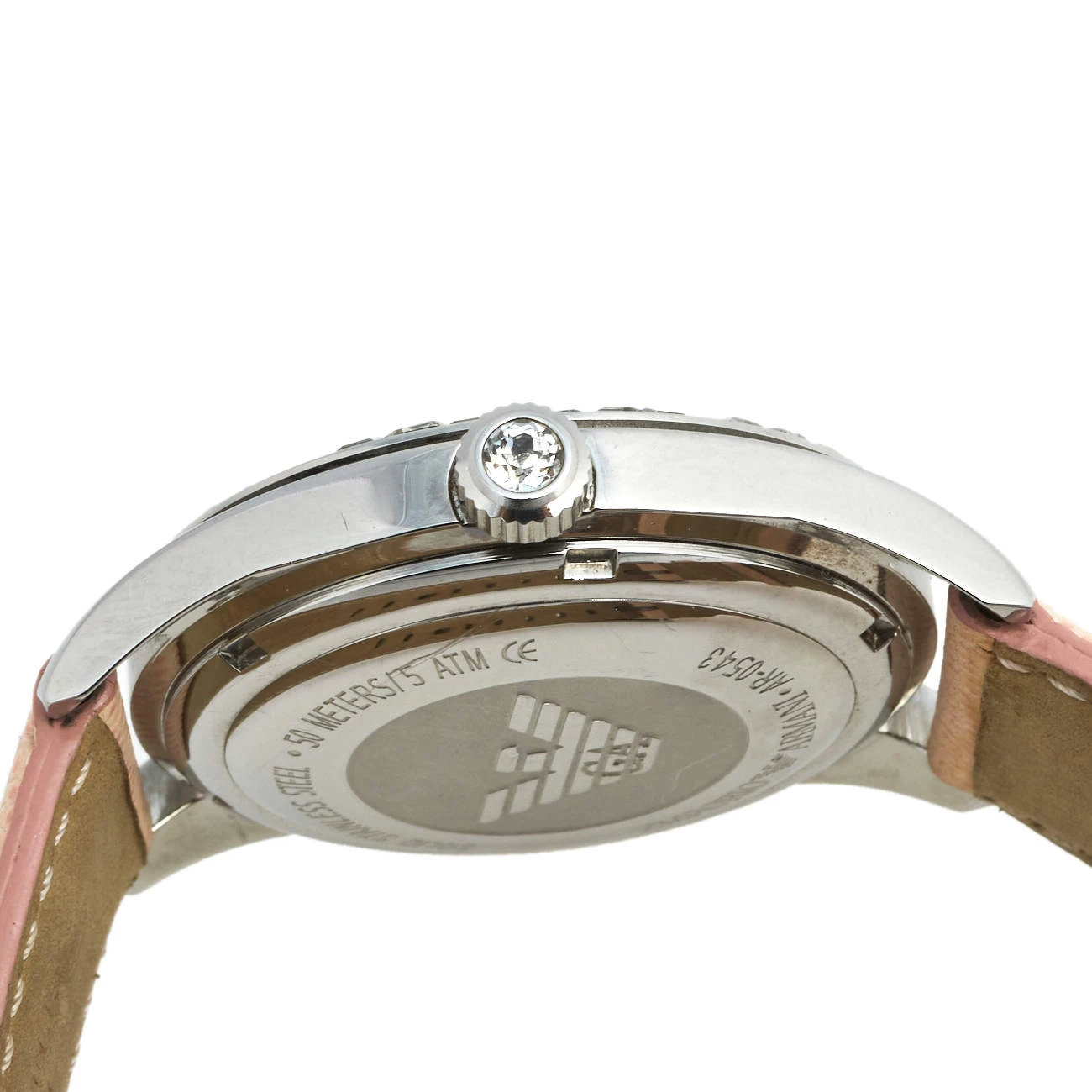 This stainless steel women’s wristwatch by Emporio Armani is a fashionable choice for everyday use. The watch features a Mother of Pearl dial and a beautifully-embellished bezel. It is complete with a subtly-hued leather bracelet.