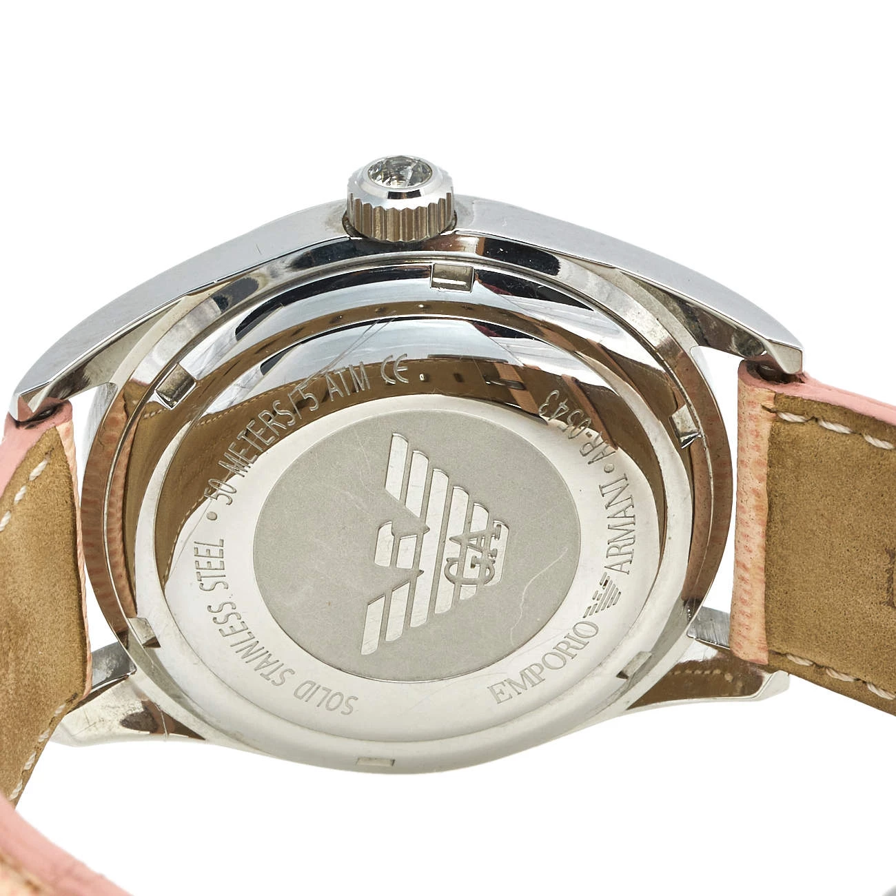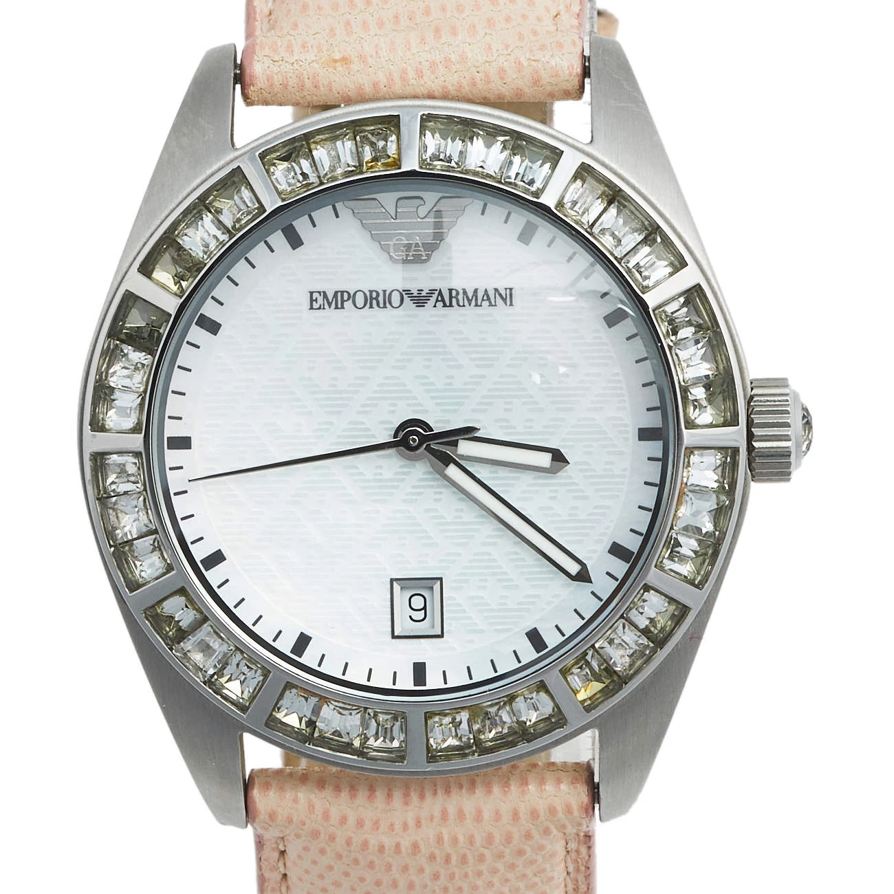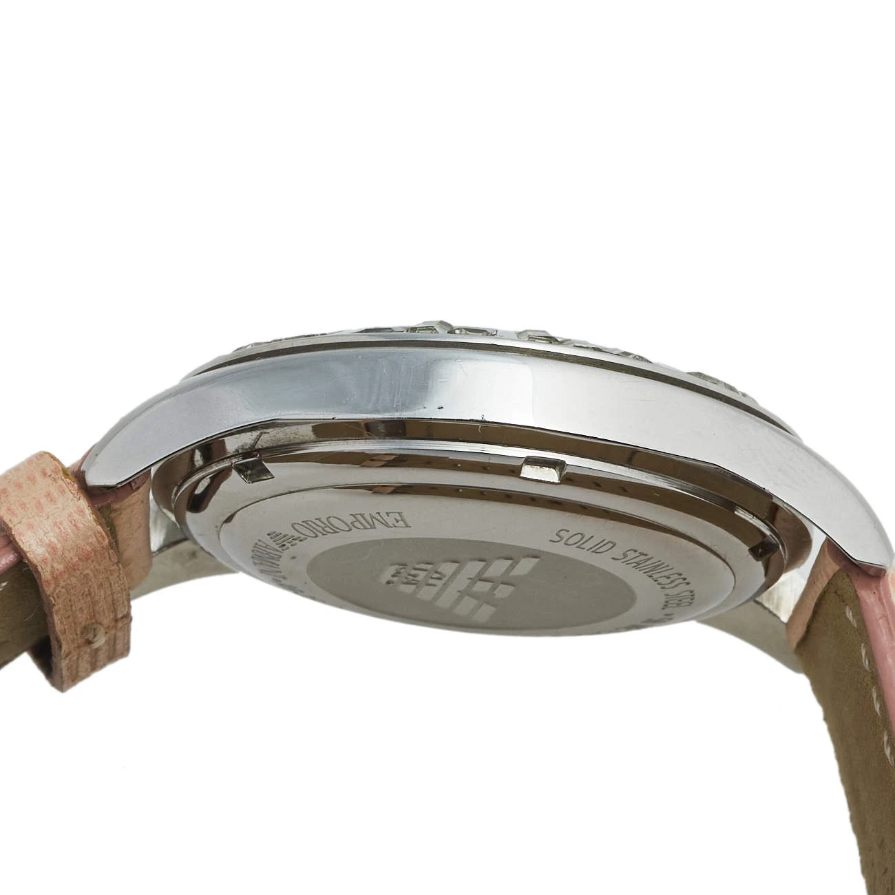 This stainless steel women’s wristwatch by Emporio Armani is a fashionable choice for everyday use. The watch features a Mother of Pearl dial and a beautifully-embellished bezel. It is complete with a subtly-hued leather bracelet.