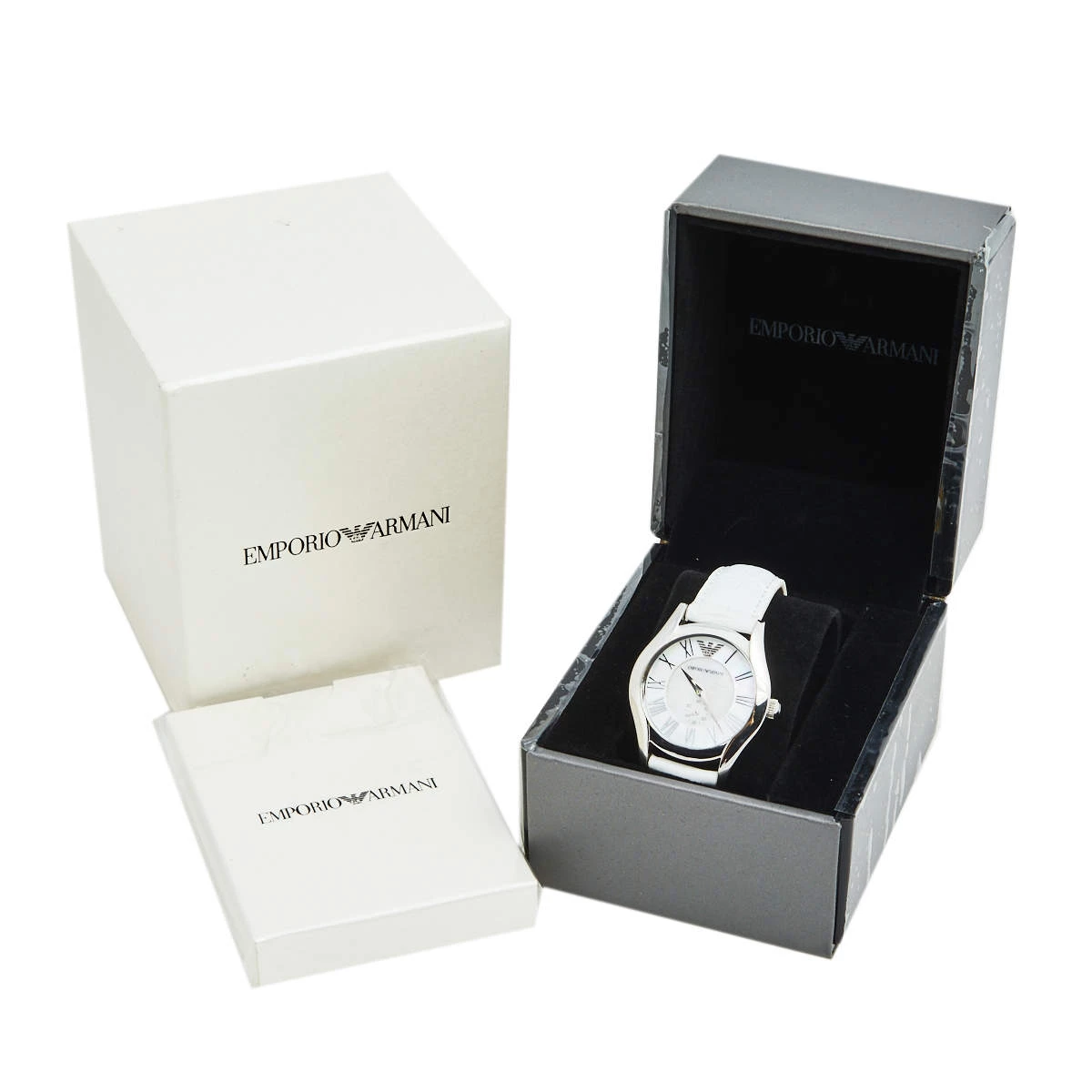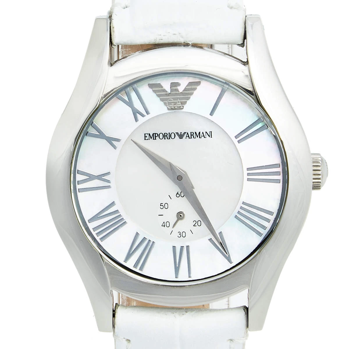 This stainless steel women’s wristwatch by Emporio Armani is a fashionable choice for everyday use. The watch features a round, smooth bezel and a mother of pearl dial housing silver-tone markers, two hands, and logo details.