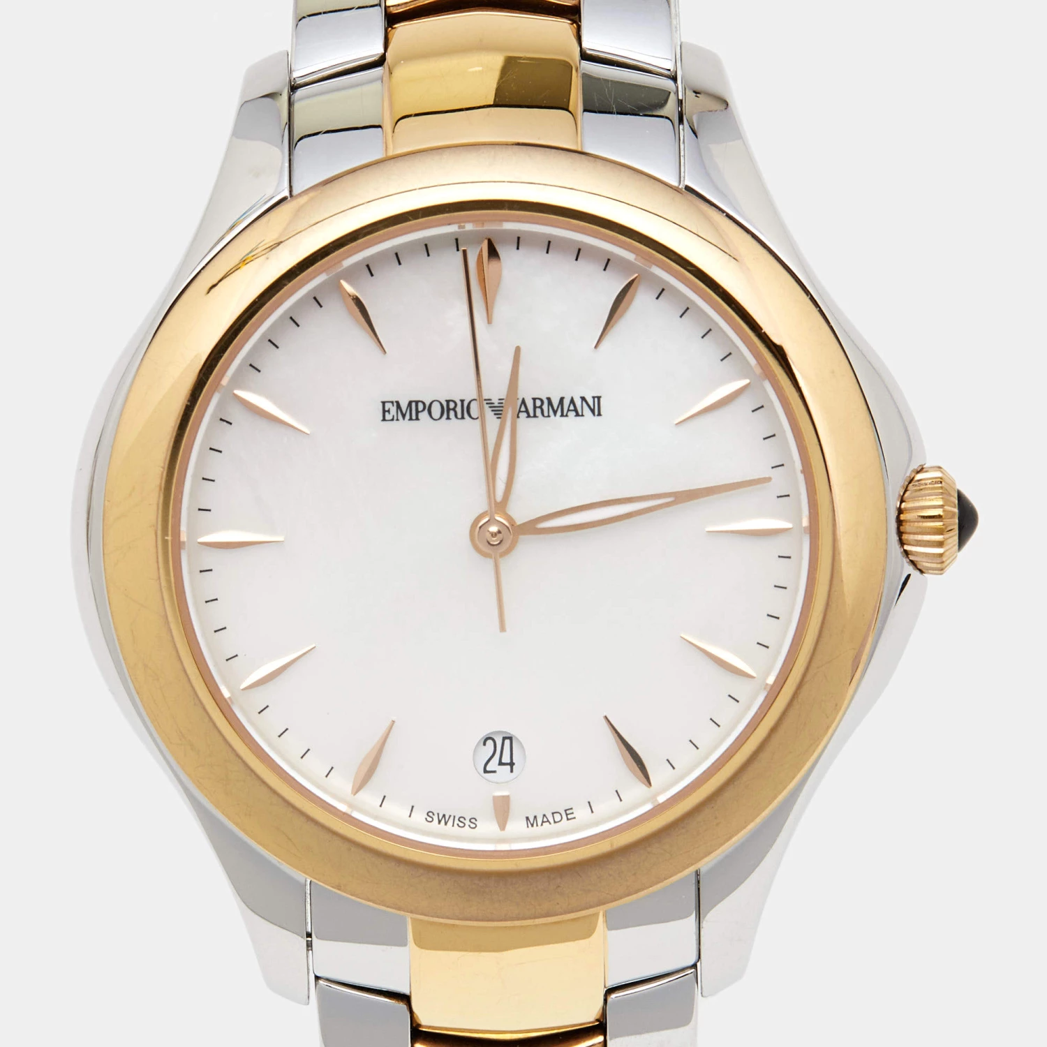 Your everyday style deserves a hint of luxury like this wristwatch from Emporio Armani. It is made from two-tone stainless steel and has a mother of pearl dial with gold-tone hours markers, minute markers around the outer rim, a date window, and three hands. The watch is complete with a link bracelet.