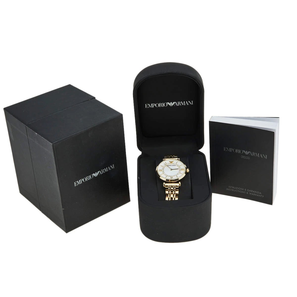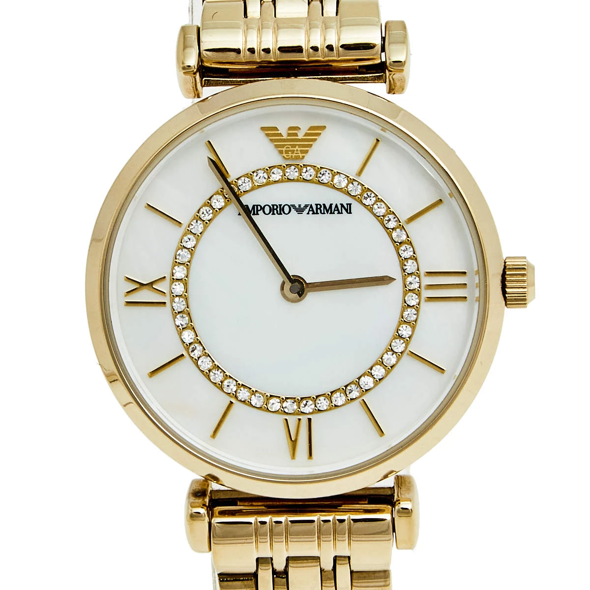 This Emporio Armani watch in gold-plated stainless steel features a round bezel and a Mother of Pearl dial. Designed to be ideal for everyday use, the quartz watch comes fitted with a simple clasp to the comfortable bracelet.