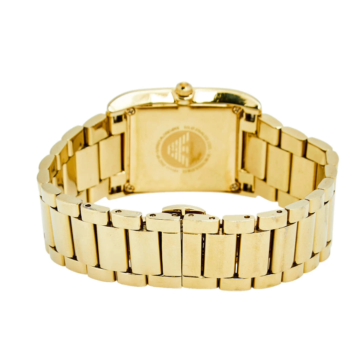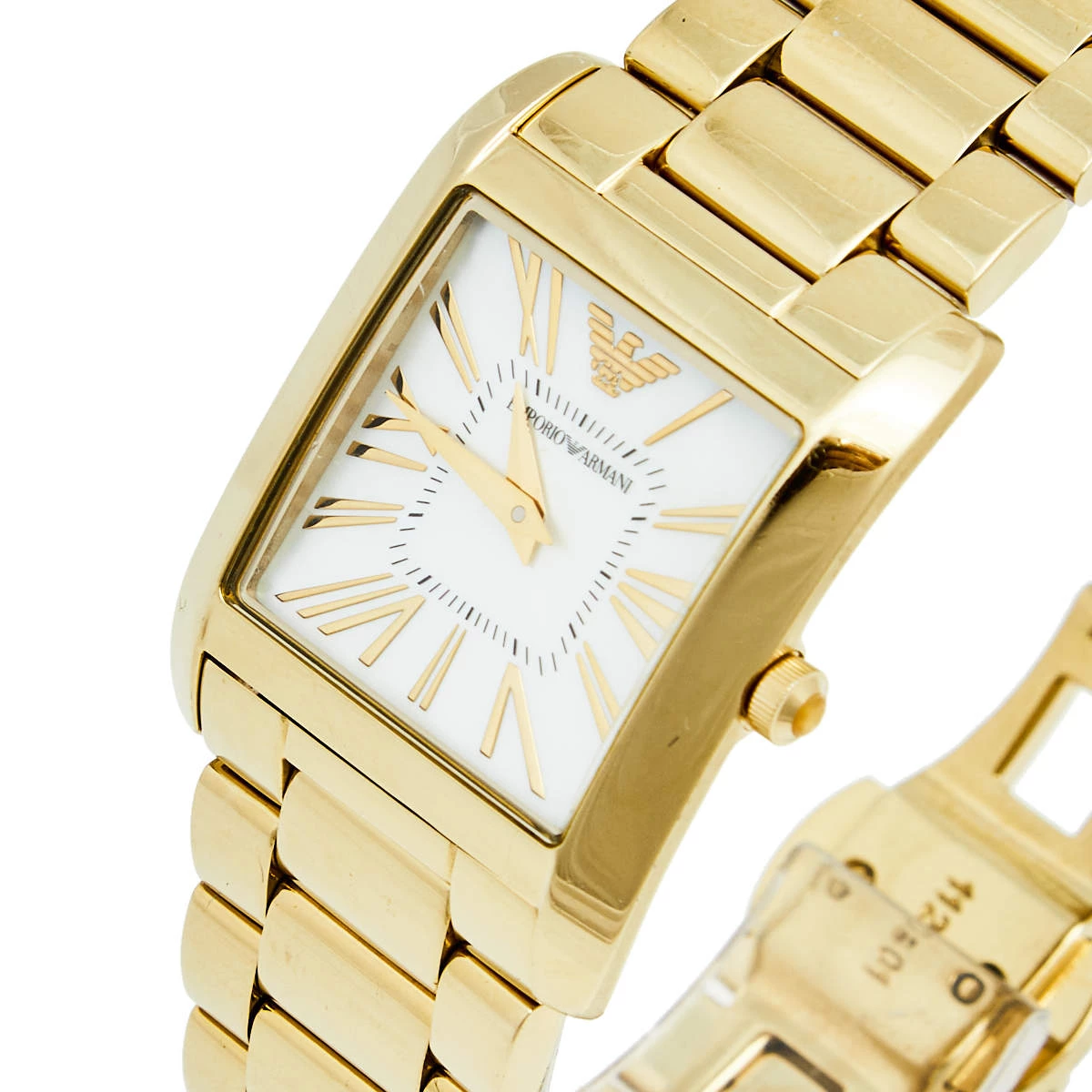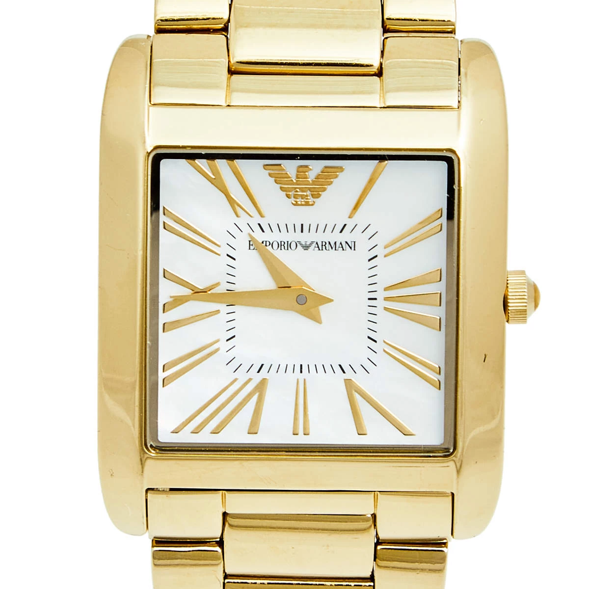 This elegant Emporio Armani wristwatch is made from gold-plated stainless steel featuring a 27 mm case held by a classic link bracelet. The mother of pearl dial is smooth and fixed with Roman numeral hour markers and the brand logo. The quartz watch has a smooth bezel and can be fastened to your wrist using the push clasp.