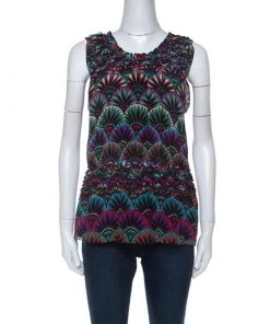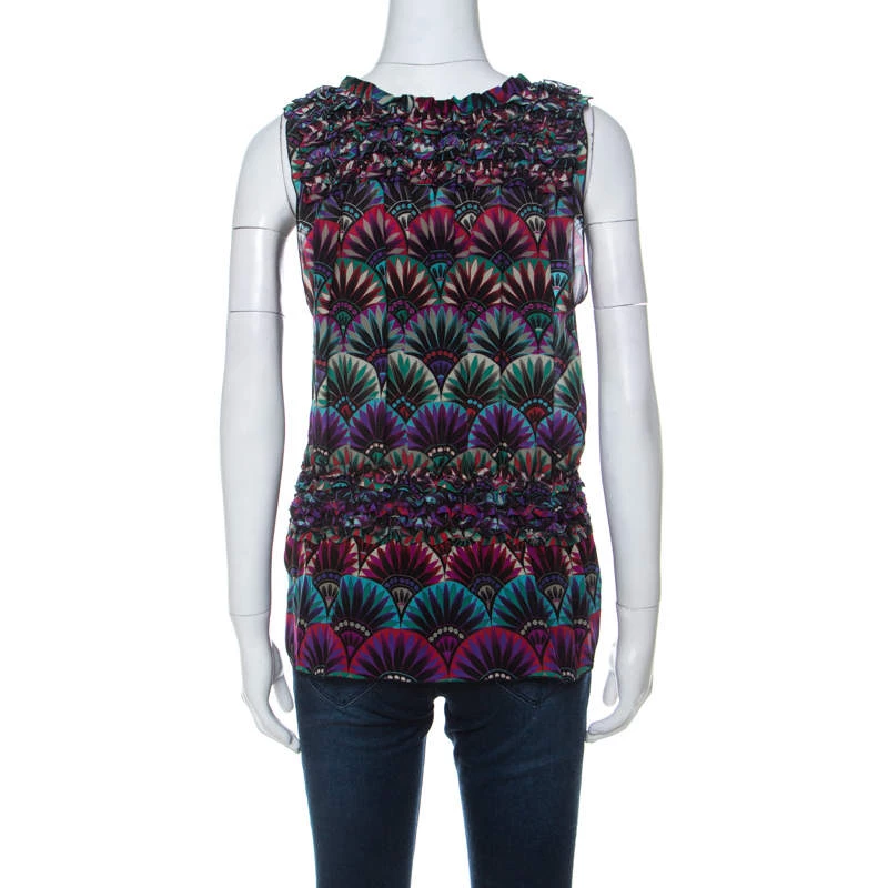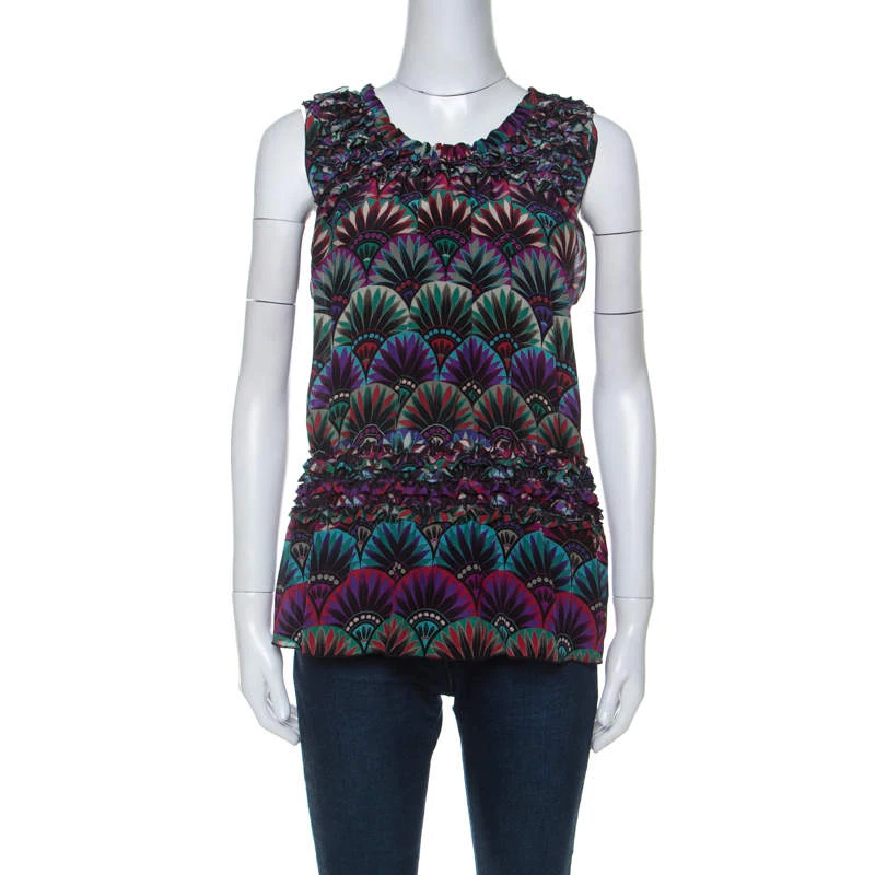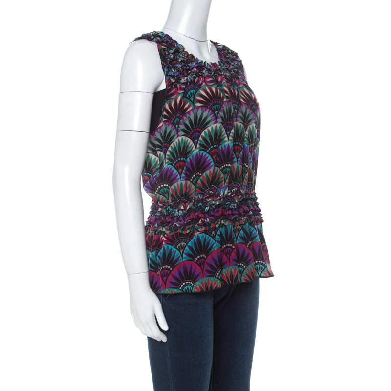 This Emporio Armani top is a celebration of classic aesthetics and easy fashion. This sleeveless top features elasticized ruffle details and floral prints all over. This 100% Mulberry silk top is a minimalistic everyday wear essential perfect for you.