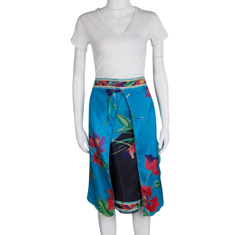This skirt will make you want to take a trip to the beaches in the far East! 100% silk skirt has a charming multicolor floral print on a pastel blue base. The skirt is layered and is a variation of a classic kick-pleat skirt. Finished with a neat waist belt the skirt extends till the knee and will pair well with your fitted white/ off-white shirts and blouses.