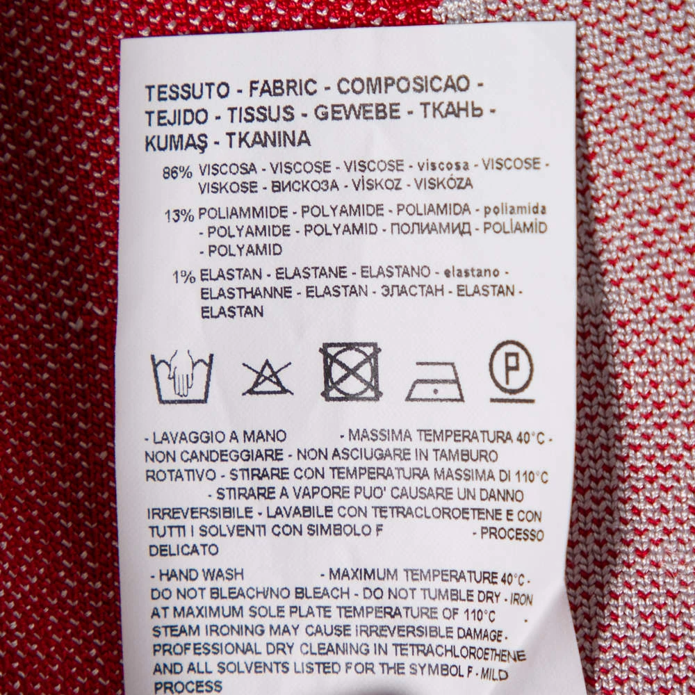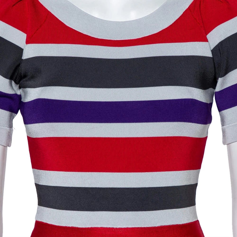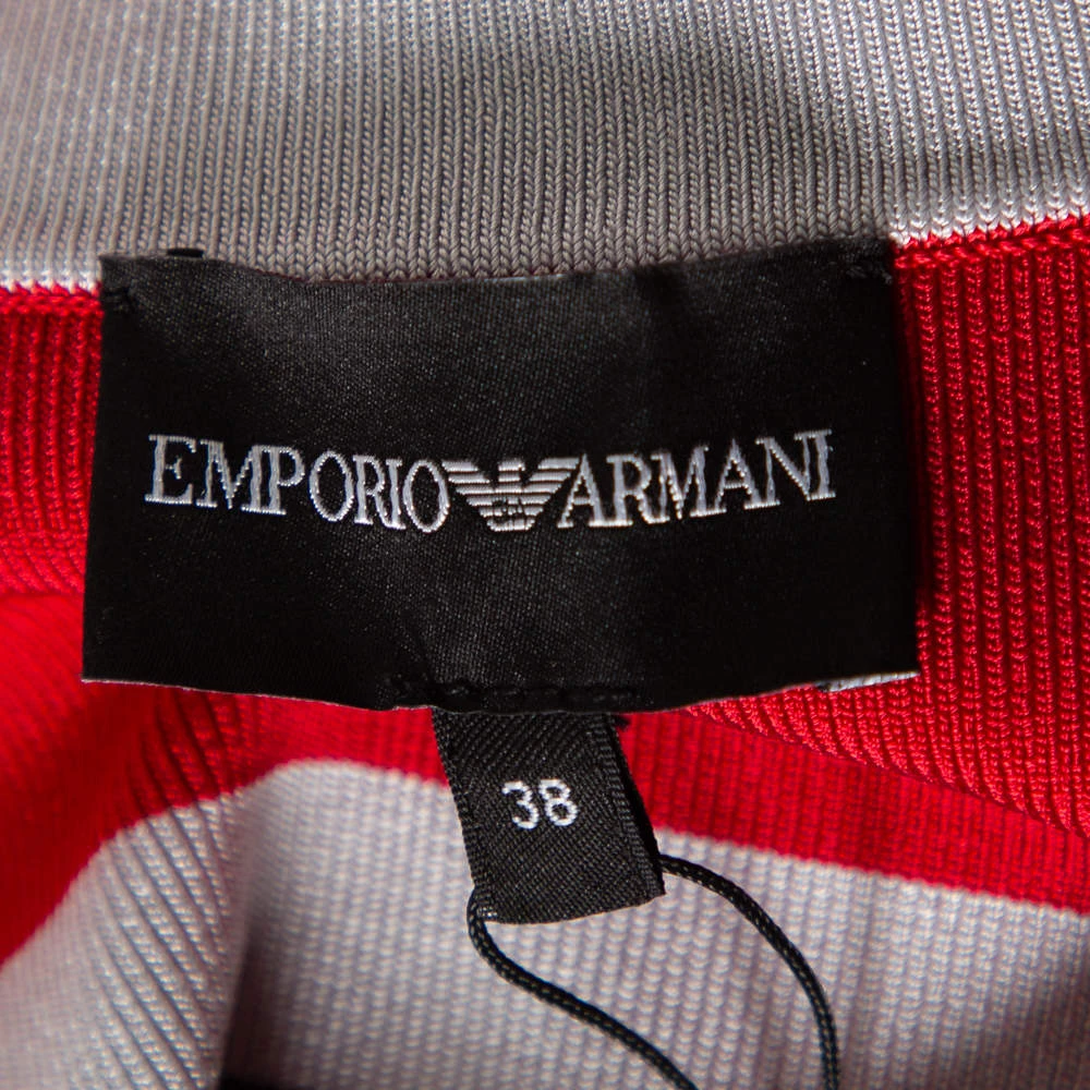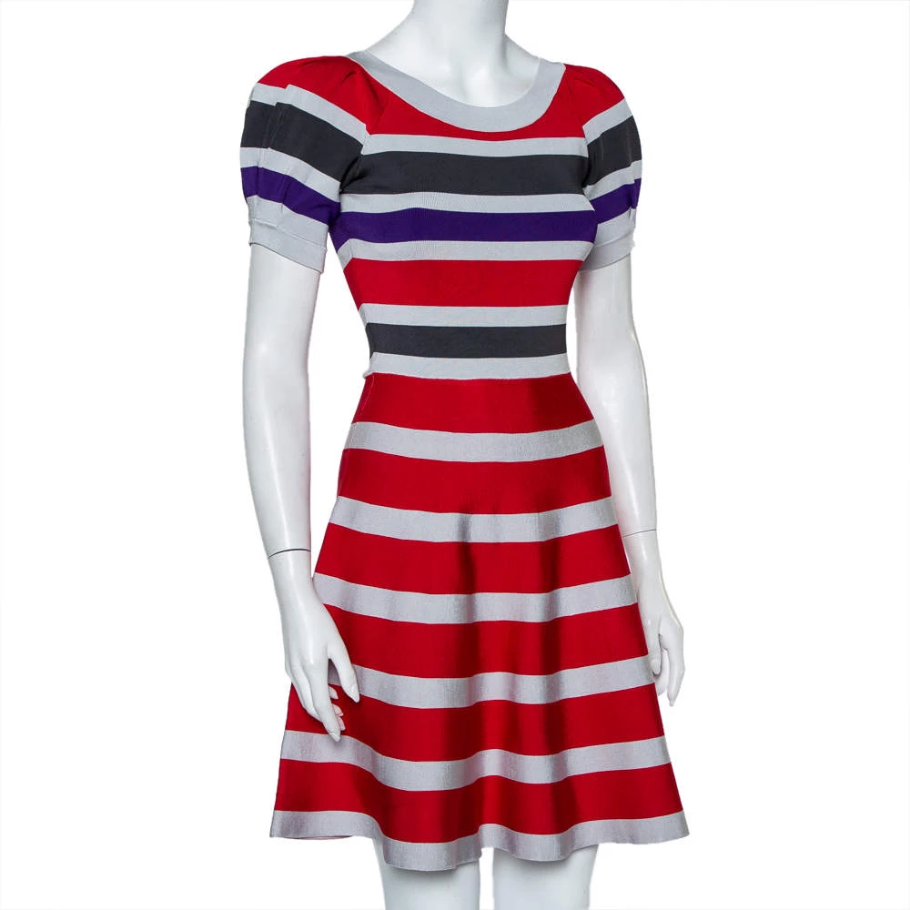 A striped dress with puff sleeve detailing makes up the final design of this Emporio Armani creation. The dress has a defined waistline, a simple neckline, and a slightly flared skirt.