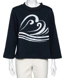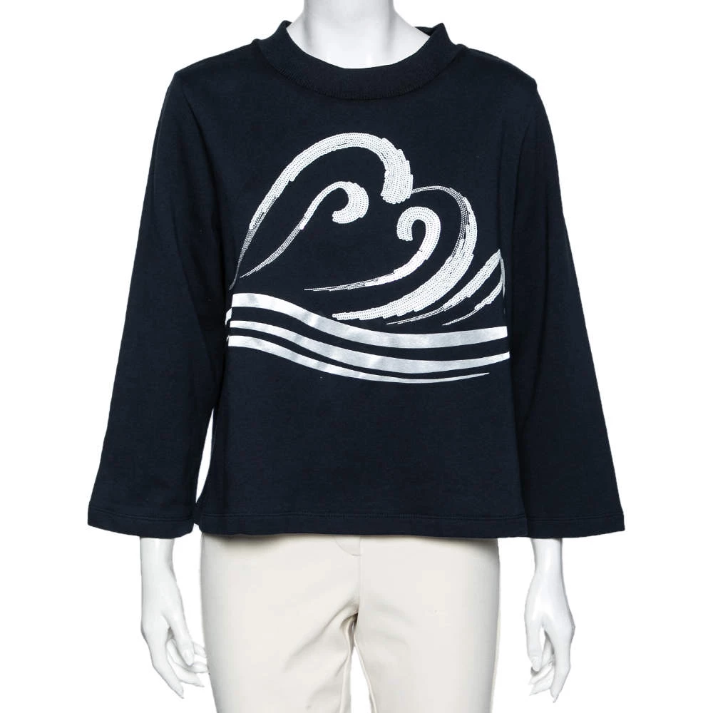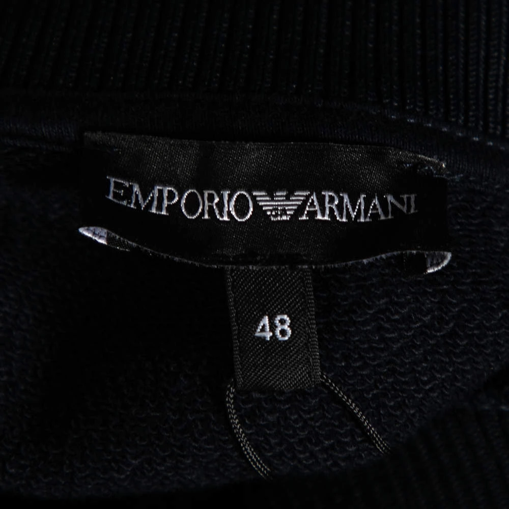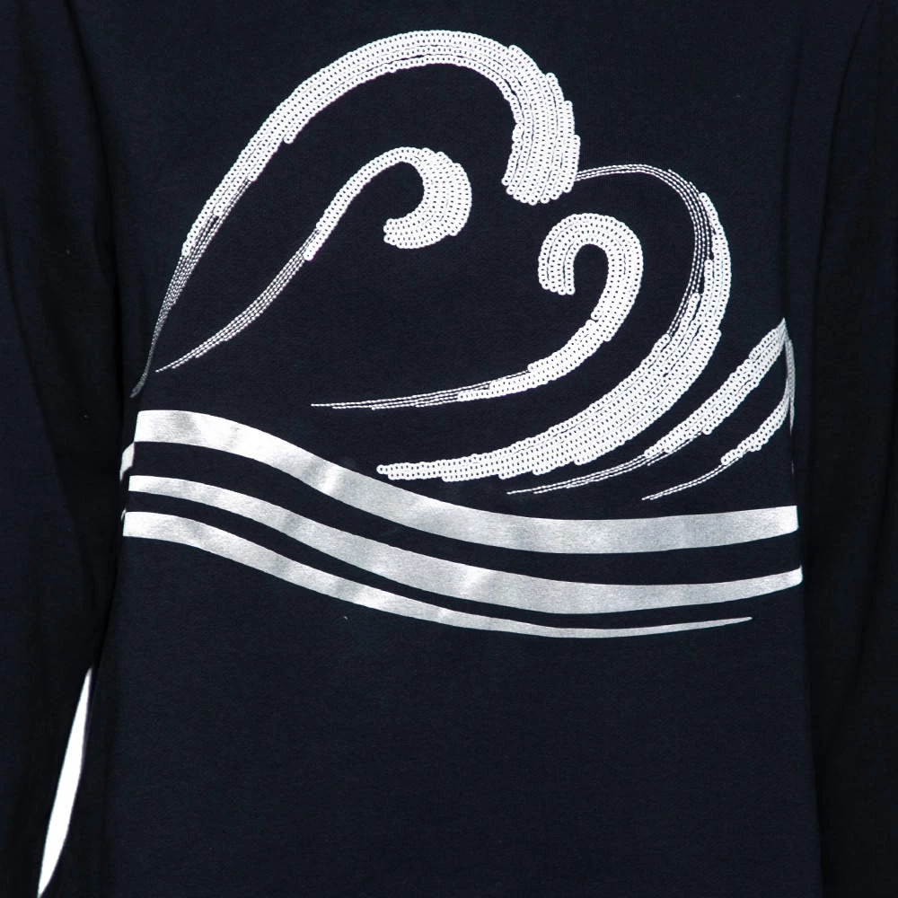 This comfy sweatshirt comes from the house of Emporio Armani. It is crafted from cotton and comes in a lovely shade of navy blue. It has long sleeves, a round neck, and an embellished wave design on the front.