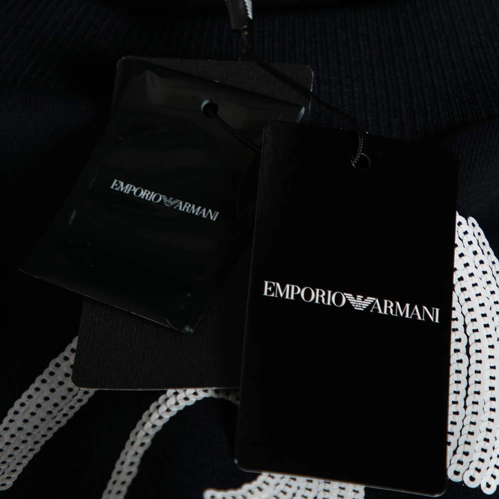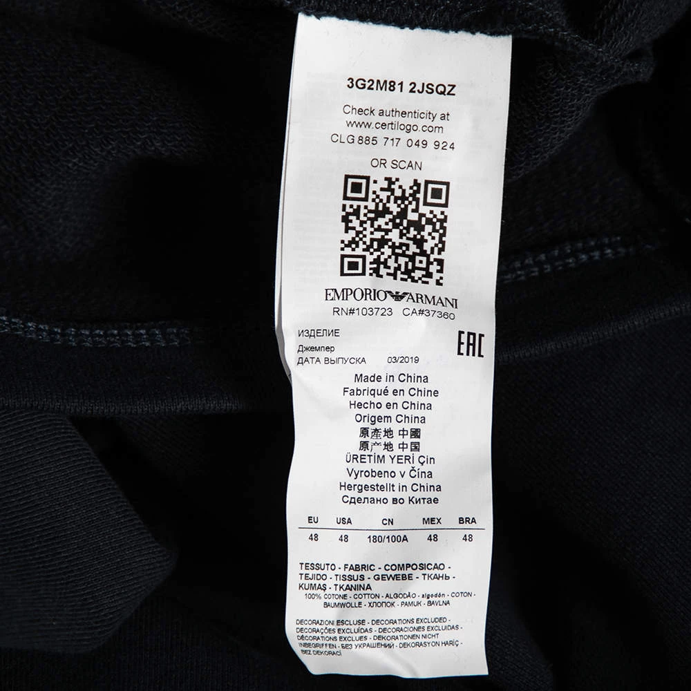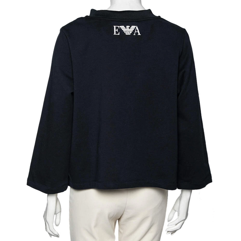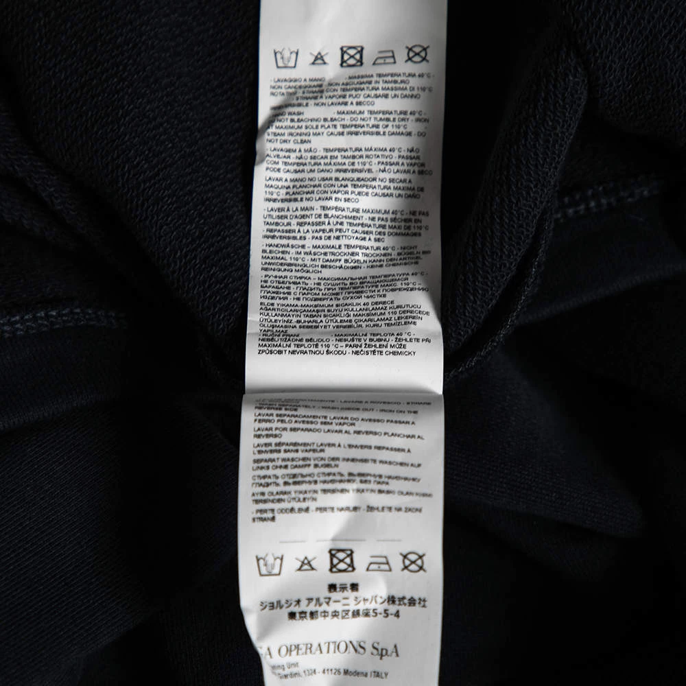 This comfy sweatshirt comes from the house of Emporio Armani. It is crafted from cotton and comes in a lovely shade of navy blue. It has long sleeves, a round neck, and an embellished wave design on the front.