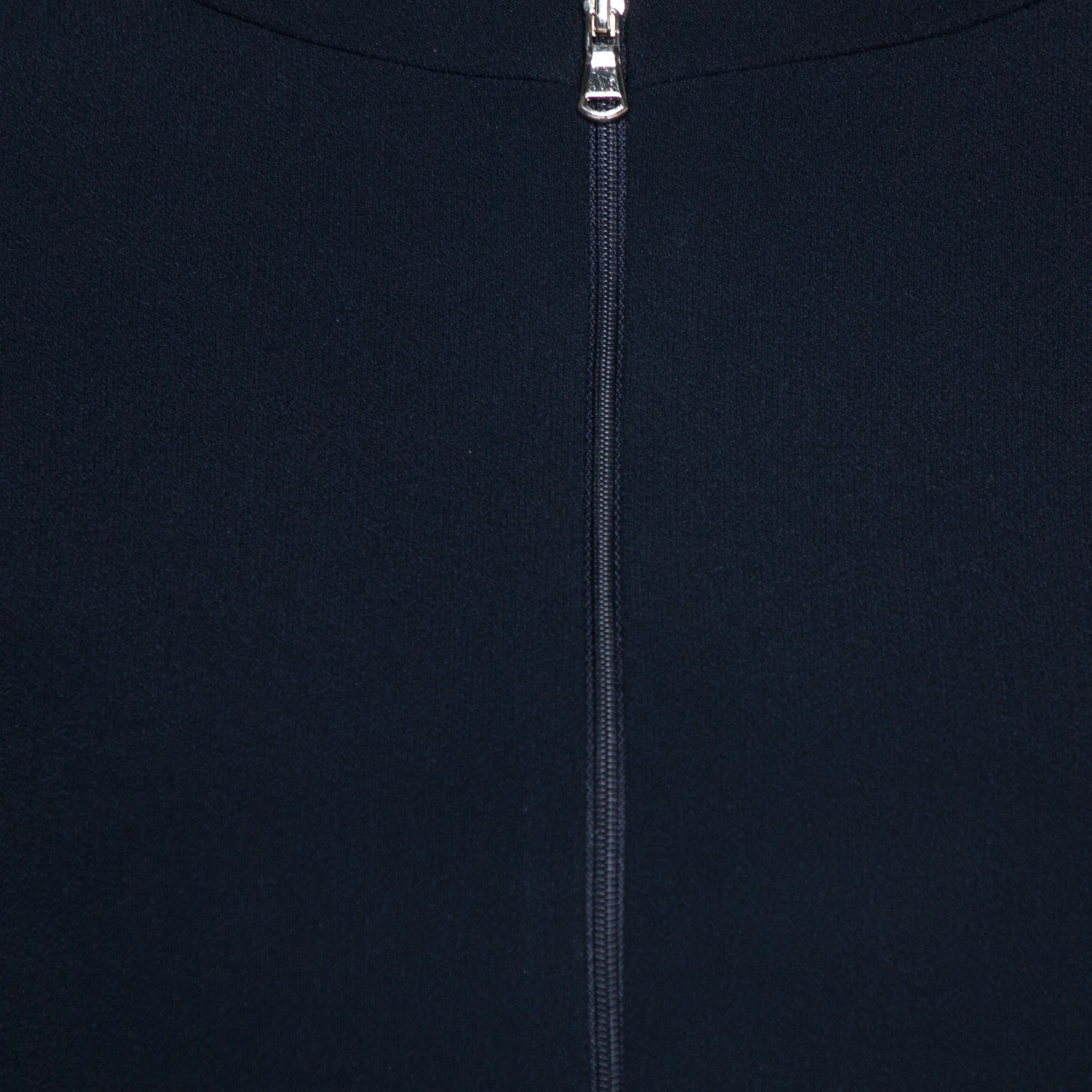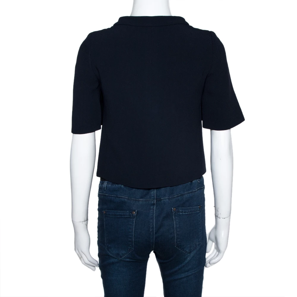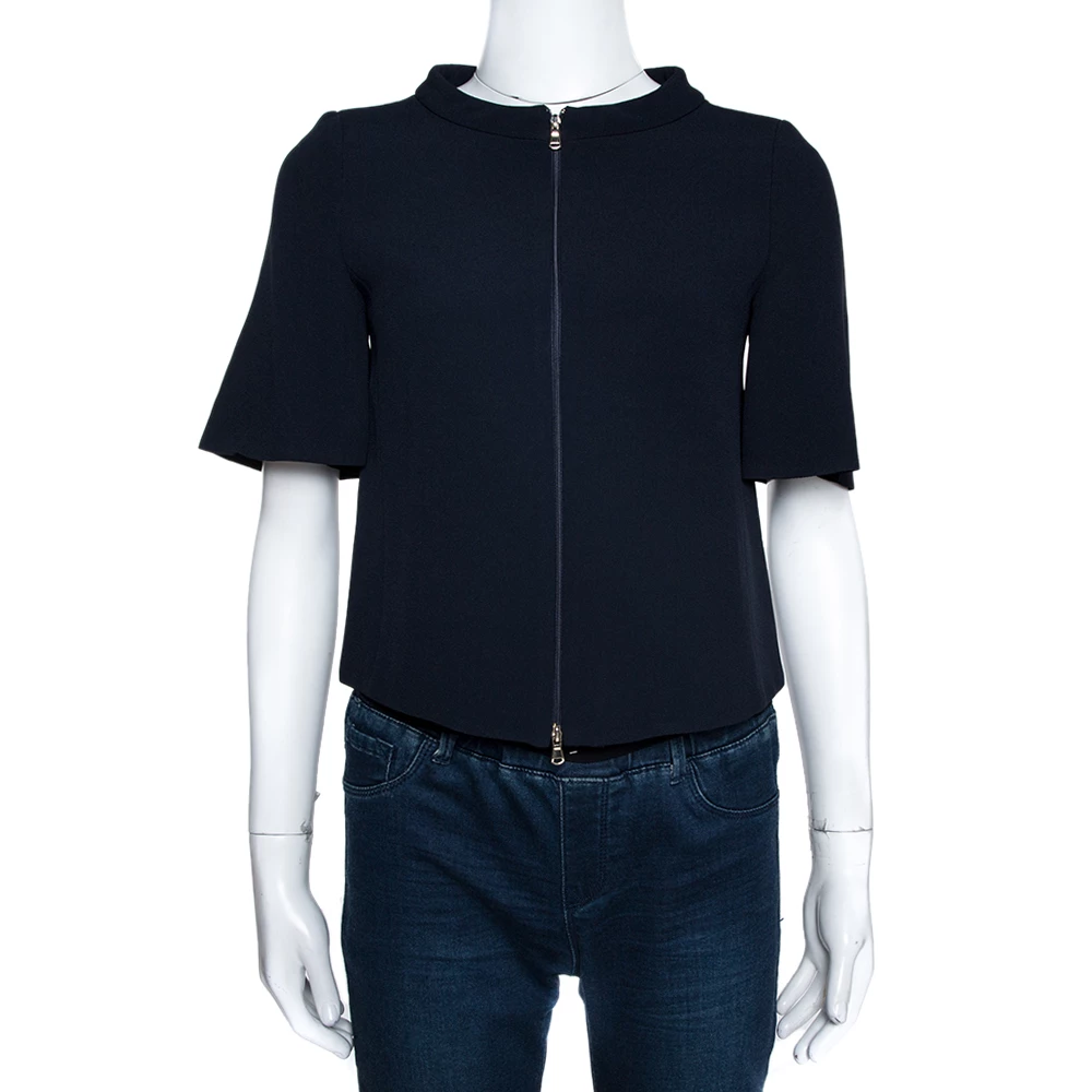 Sophisticated and stylish, this lovely jacket by Emporio Armani is a great option for formal ensembles. Crafted from navy blue crepe, it has a tailored silhouette. It is styled with short sleeves, a zip front and a flattering fit. Pair with sleek trousers and heels.