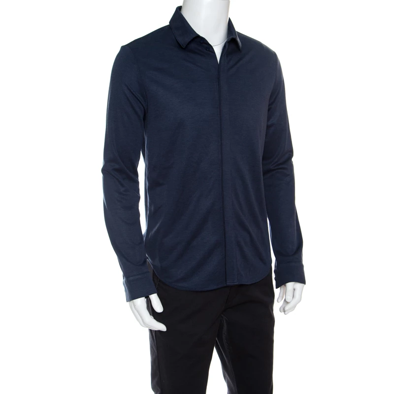 This fabulous shirt from Emporio Armani deserves a very special place in your wardrobe. The navy blue creation is made of a cotton and silk blend and features a jacquard knit pattern. It flaunts classic collars, concealed front button fastenings and long sleeves. Pair it with denims or trousers and oxford shoes to look chic and stylish.