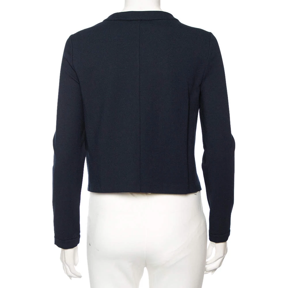 Emporio Armani delights us with this wonderful navy blue cardigan. It is knit from quality fabrics and styled with long sleeves, front buttons, and a good fit. The cardigan will be a classic addition to your closet.