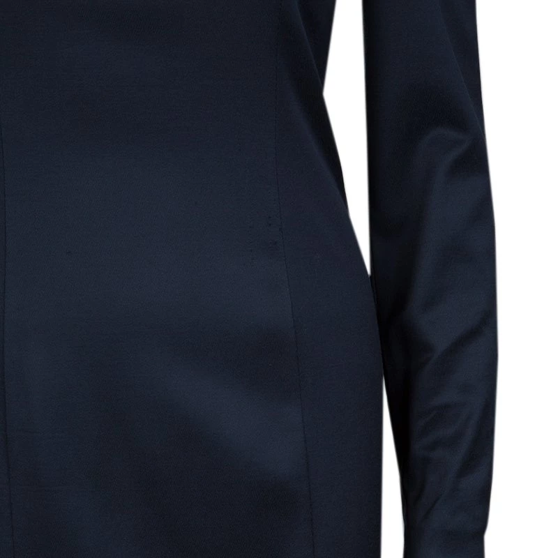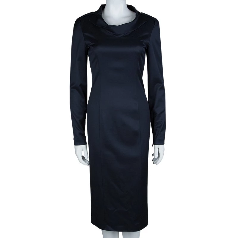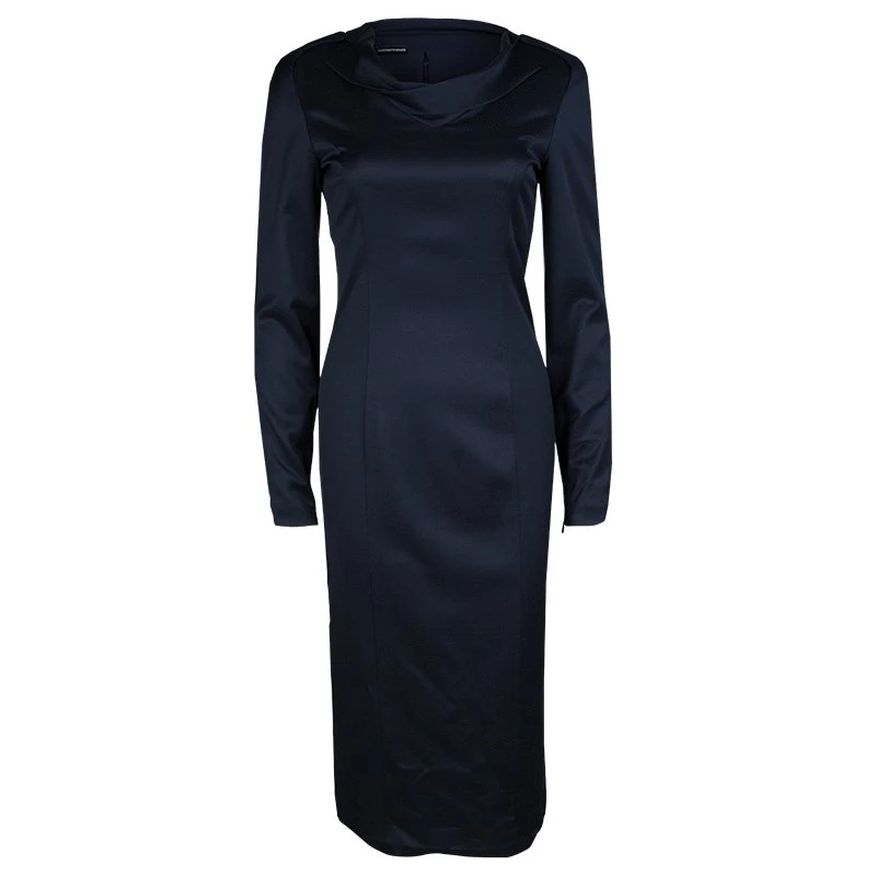 This navy blue dress by Emporio Armani is perfect for your work look. Crafted from quality fabrics, it features long sleeves along with classy collar detailing and a back bottom slit, it is equipped with a rear zipper. Contrasting pumps will complement this dress in an opulent way.