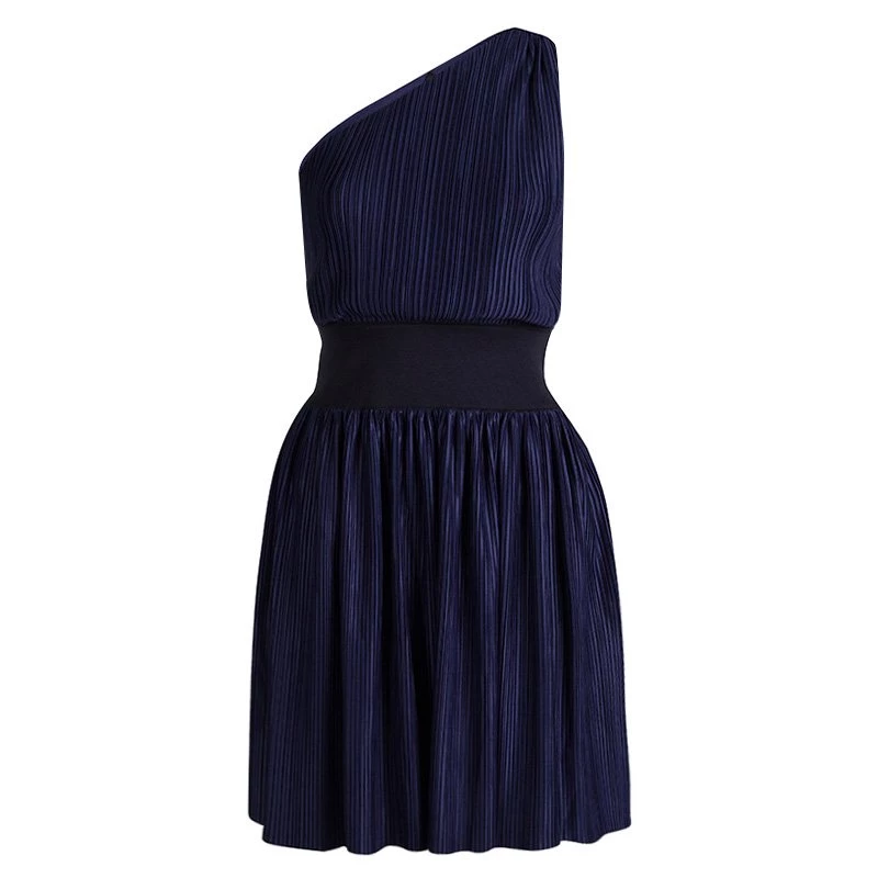 Add this stunning cocktail dress to your wardrobe! From the eponymous label Emporio Armani, this one shoulder dress is made from textured plisse fabric. The alluring navy blue color adds to the look. A broad stretchable black cinched waistband gives a slim fit and breaks the monotony of the blue. Wear gold-tone accessories to go along with this dress.