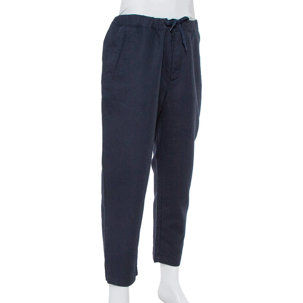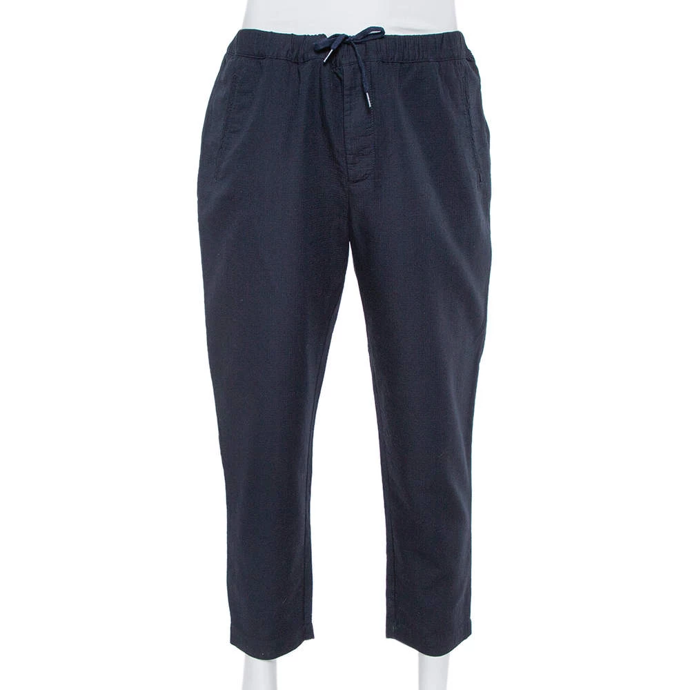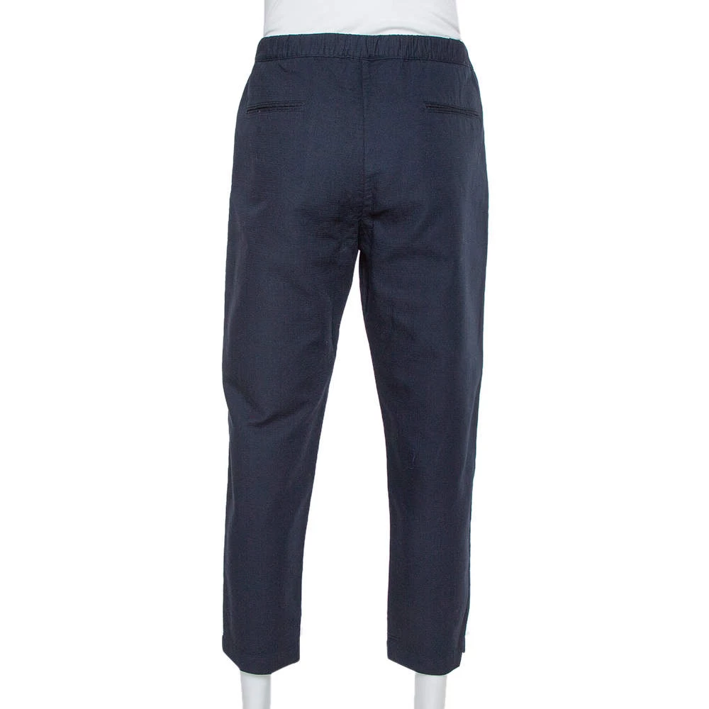 Look your best with these Emporio Armani trousers. Exclusively stitched for the sophisticated trendsetters is this pair in navy blue. Move about in comfort and style in these comfortable cotton trousers that carry a self-checked pattern, drawstring detail, and four pockets.