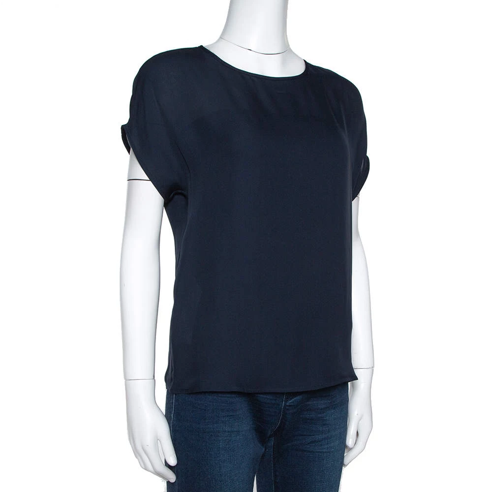 This formal blouse comes from the house of Emporio Armani. It is crafted from pure silk, it comes in a lovely shade of navy blue. It has short sleeves, round neck, keyhole detailing in the back, and a flattering fit.