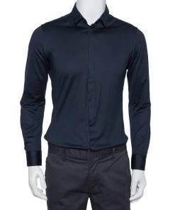 Combining top-notch style and sophistication, this Emporio Armani shirt will help you project a refined look. It comes made of stretch cotton in navy blue and features sharp collars, concealed front button fastenings, and long sleeves. It will look great with straight-leg trousers and smart oxfords.