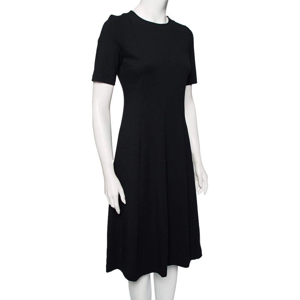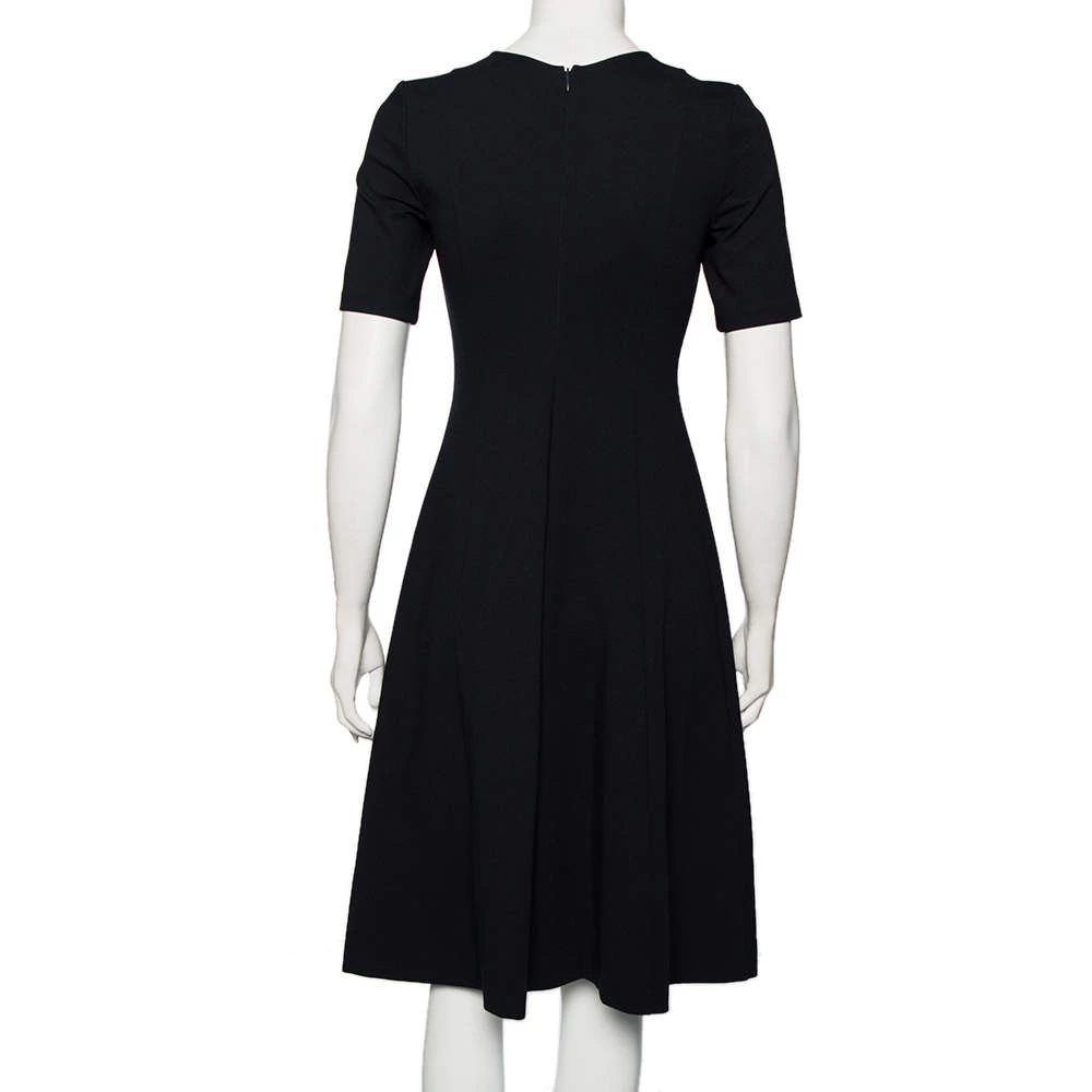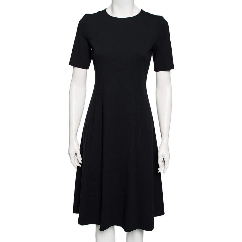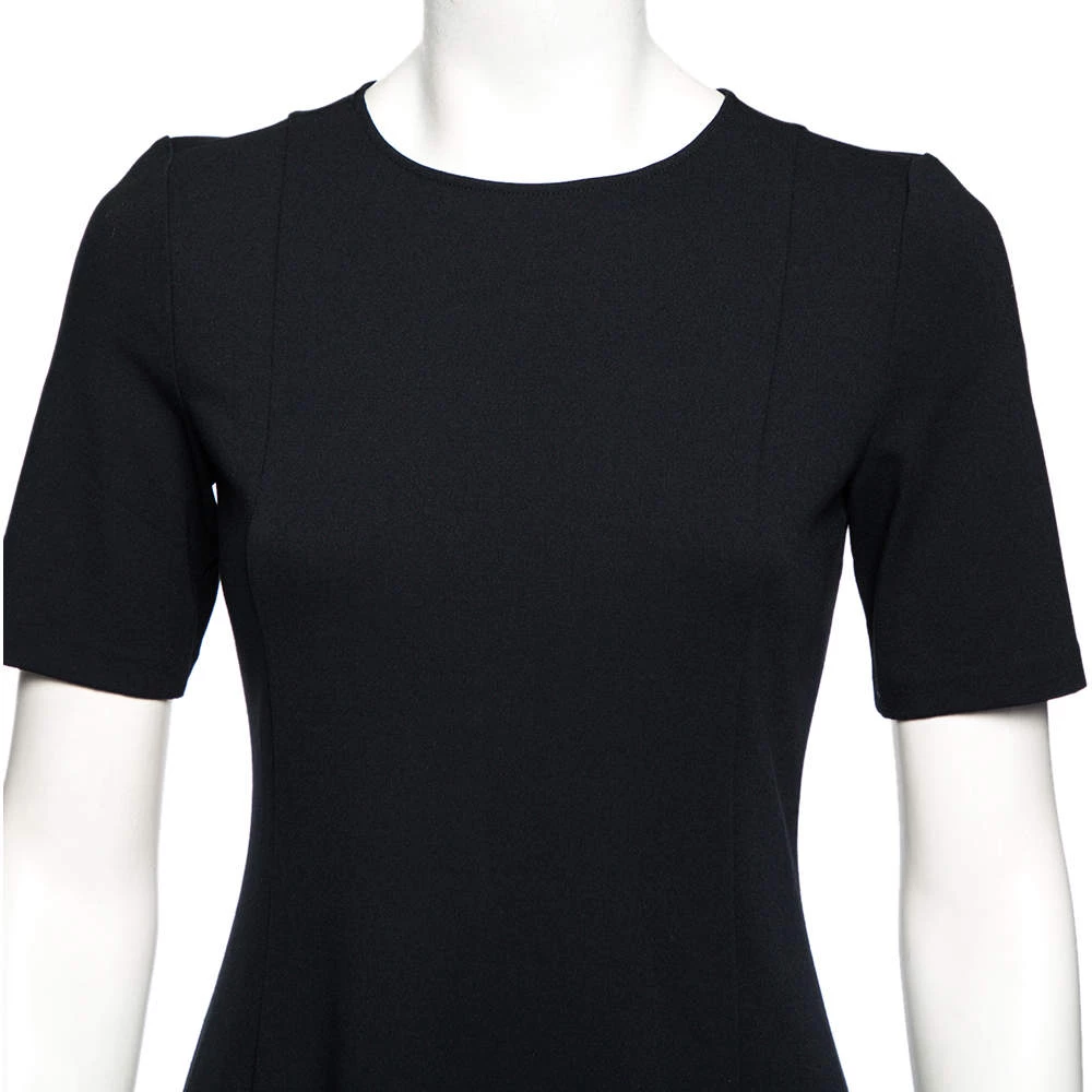 This Emporio Armani dress is perfect for formal events. Crafted from stretch knit fabric, it comes in a lovely shade of navy blue. It has a flared silhouette, round neck, short sleeves, and a flattering fit. It is secured with a zip closure and will look chic when styled with high-heeled pumps.
