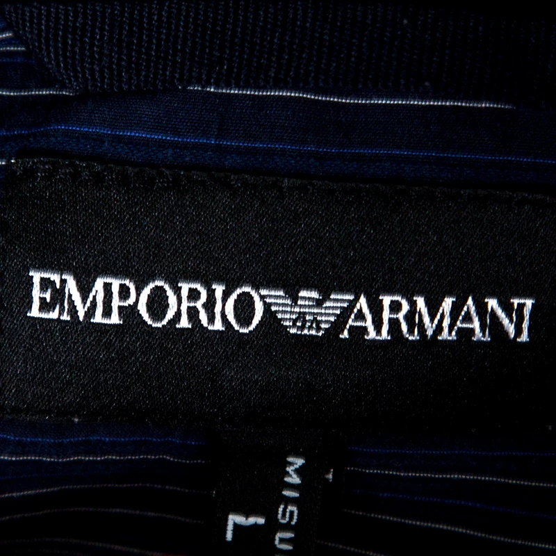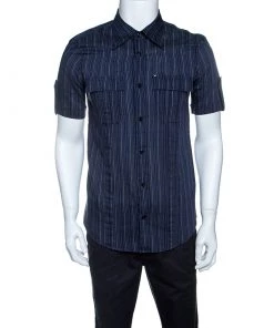 Emporio Armani’s shirt is made of a cotton blend. It carries a striped pattern all over in varied shades of blue. This one offers a fine fit and is designed with short sleeves and button front closure. It’s a summer staple that can be worn both at work and off-duty.