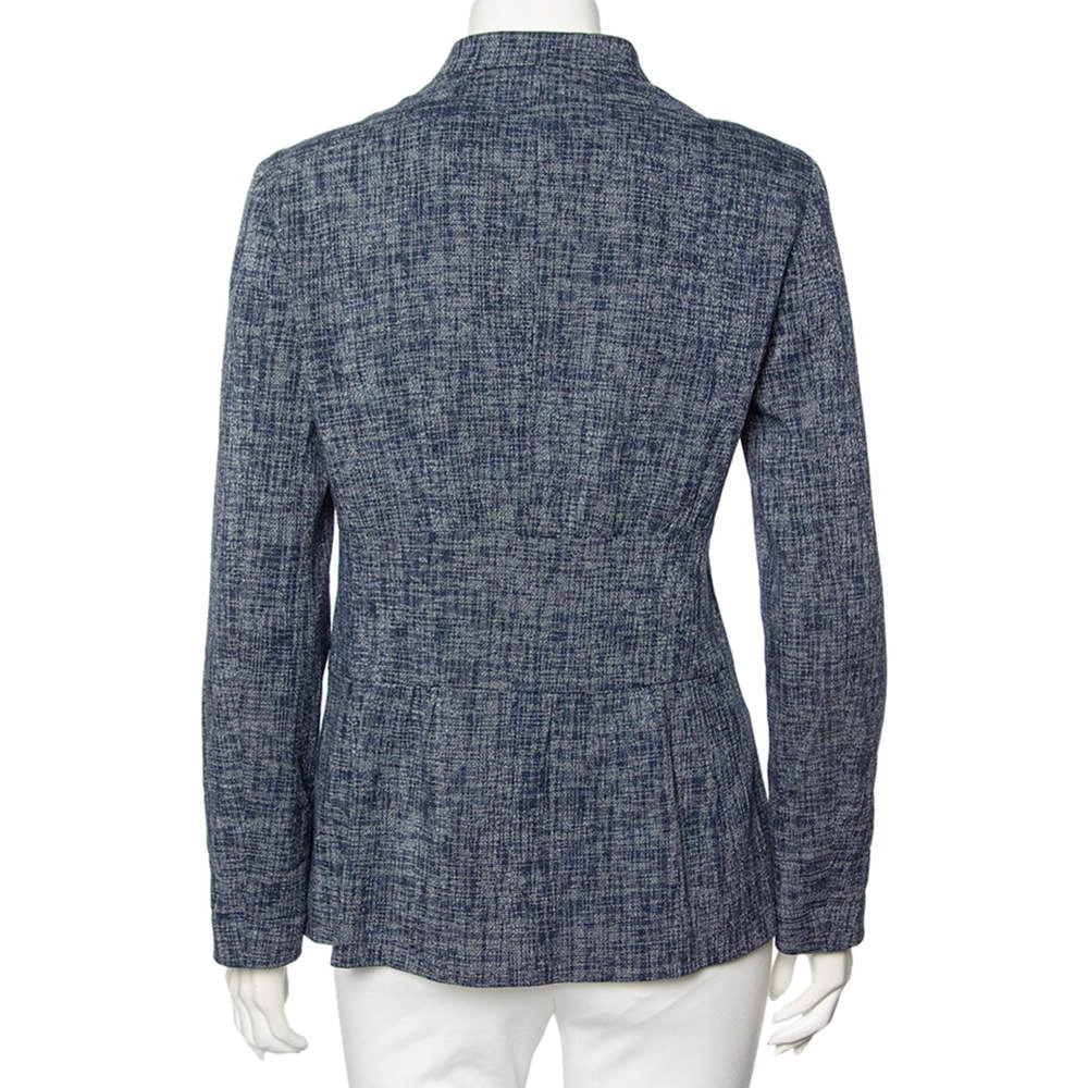 A creation that will forever be in style. Emporio Armani’s jacket in navy blue has long sleeves and buttoned closure in the front. Exuding a textured finish, it’s comfortable and luxurious. Perfect for evenings, this jacket is a piece that will always be sophisticated and timeless.