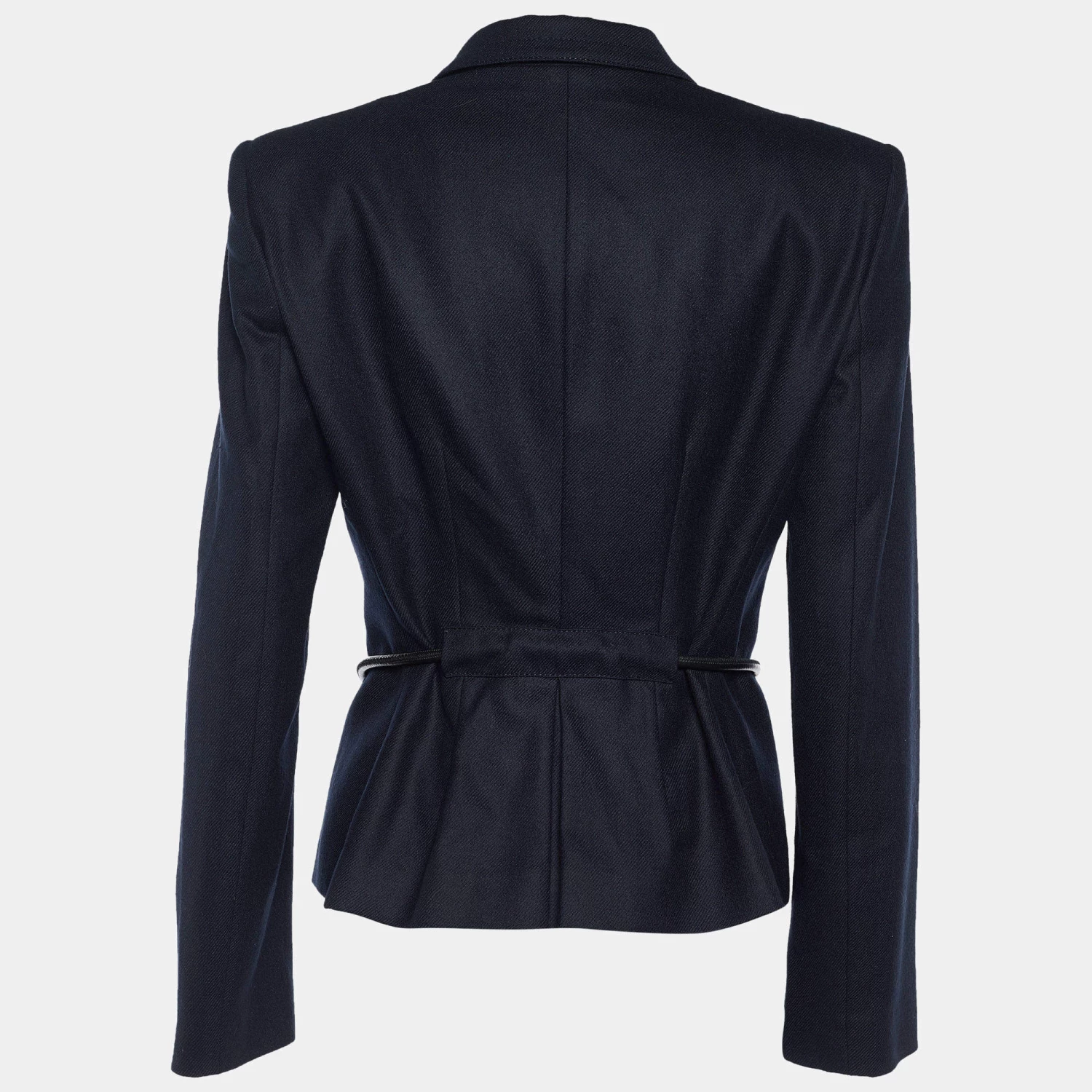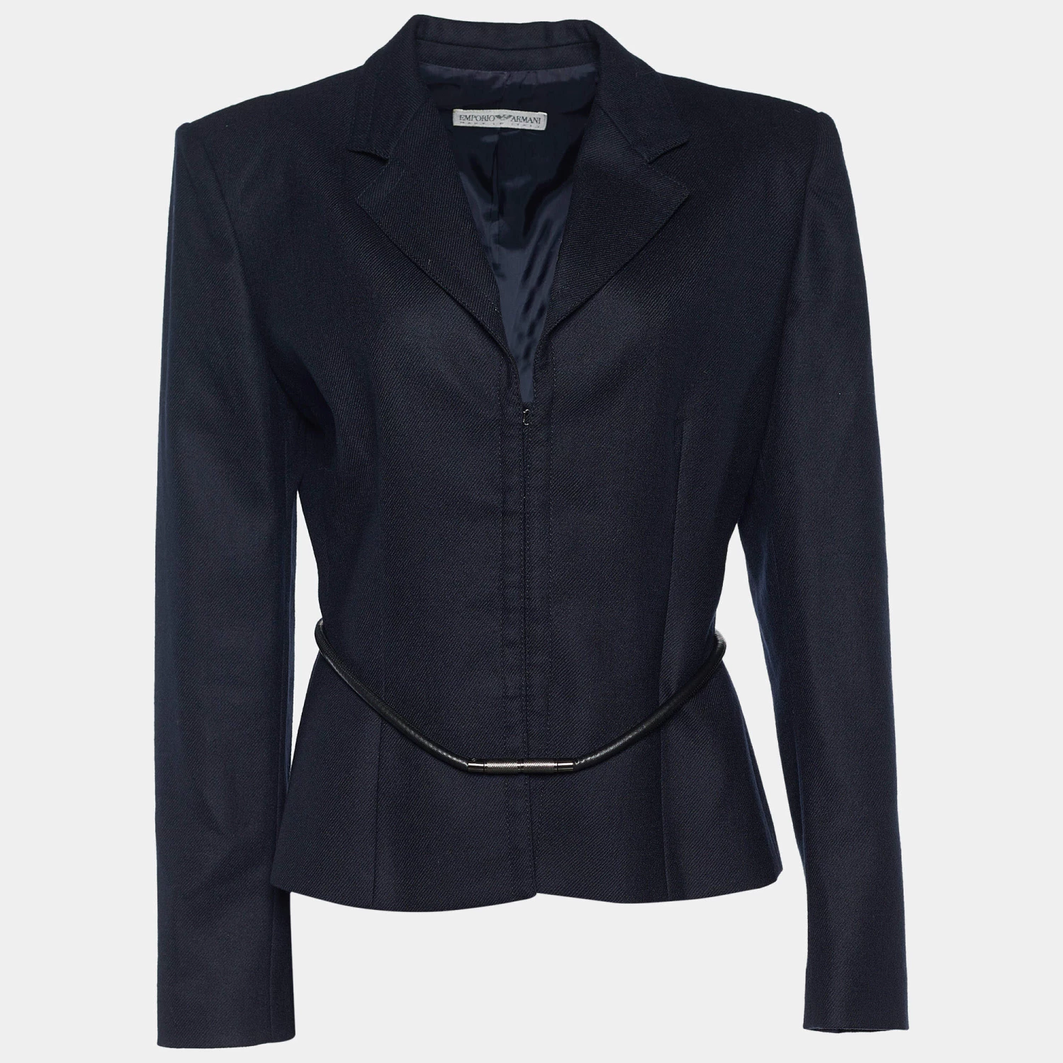 A perfect blend of fashion and functionality, this jacket from Emporio Armani is a worthy investment to make. It is designed using navy-blue wool fabric and showcases a belted feature, hook closure, and long sleeves. This stunning jacket awaits to be a part of your closet.