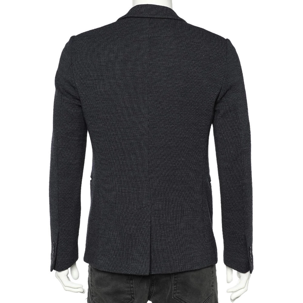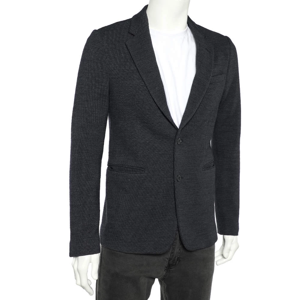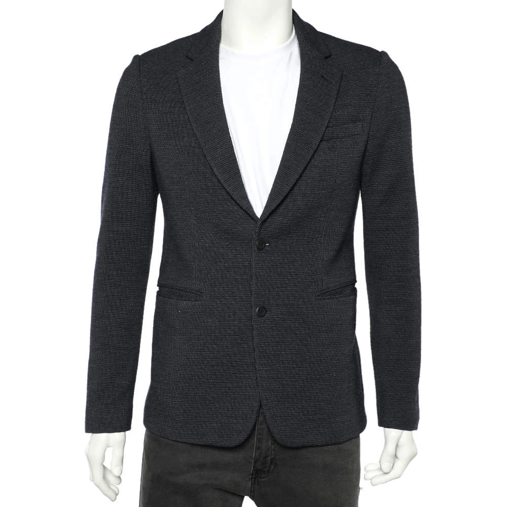 Exude charm and sophistication as you wear this Johnny Line blazer from the House of Emporio Armani. It is tailored using navy-blue wool knit fabric. It features long sleeves, buttoned closure, and three external pockets. Enhance your formal wear collection with this super stylish blazer.