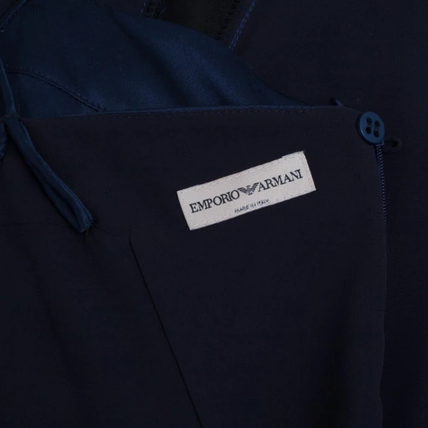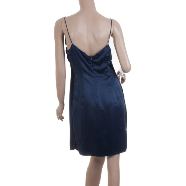 Black velvet combined with smooth navy silk make this exquisite dress by Emporio Armani a must have. It is crafted from impeccable navy blue silk with spaghetti straps. This dress is embellished with two black velvet flower motifs and black velvet stripes at the sides.