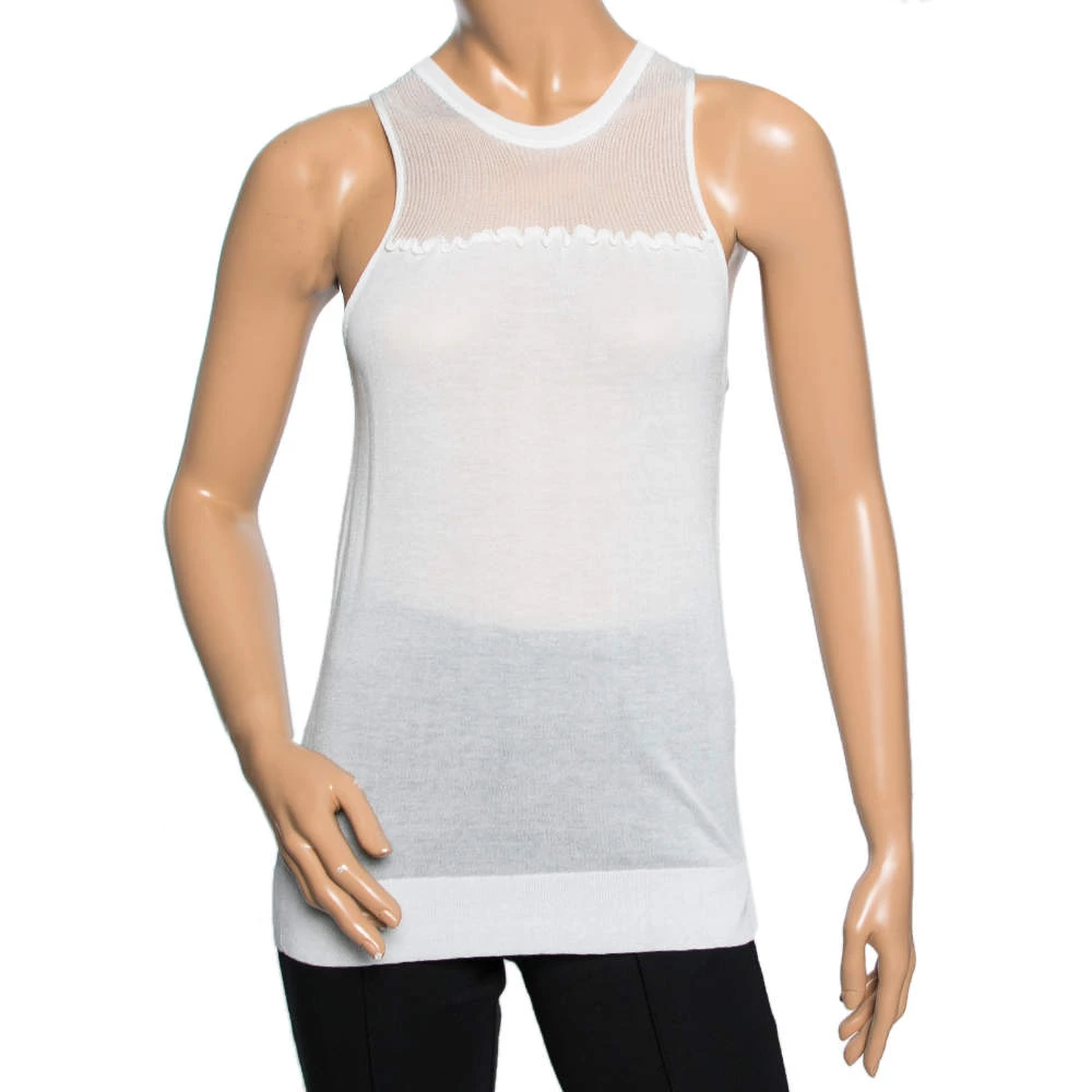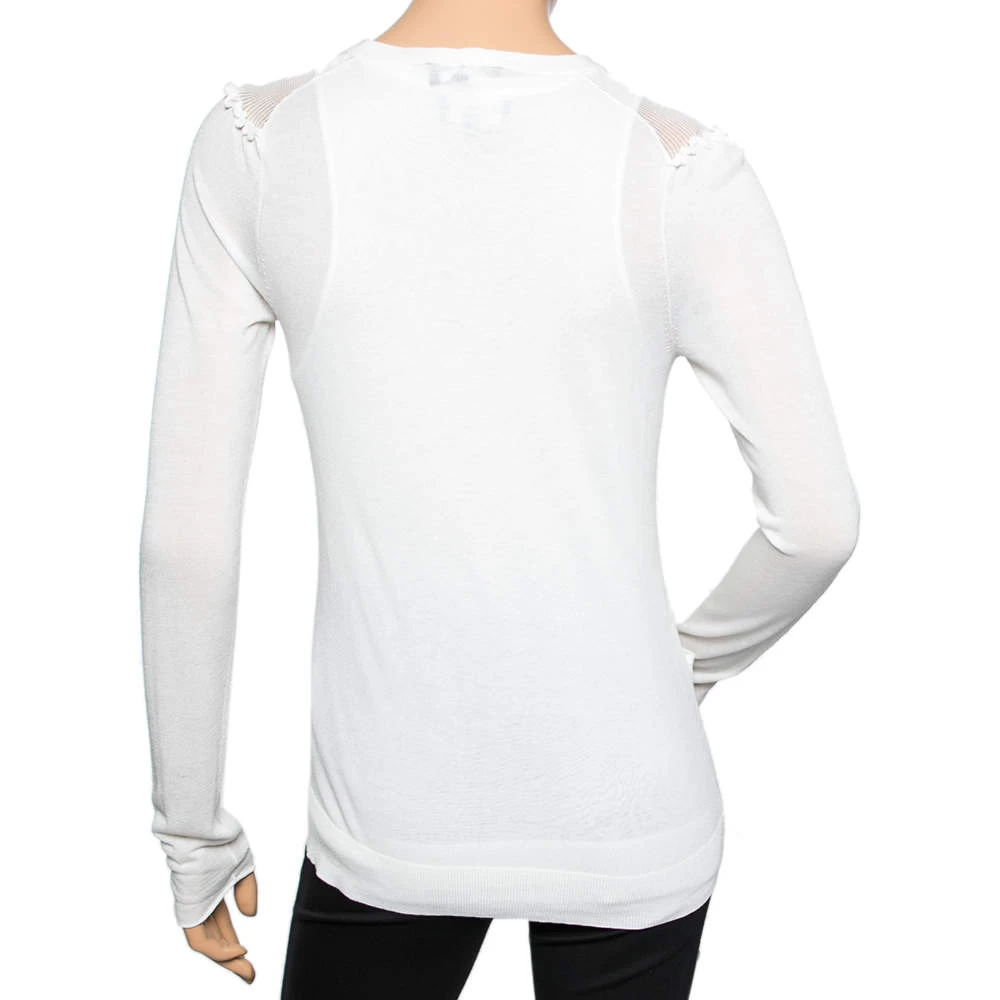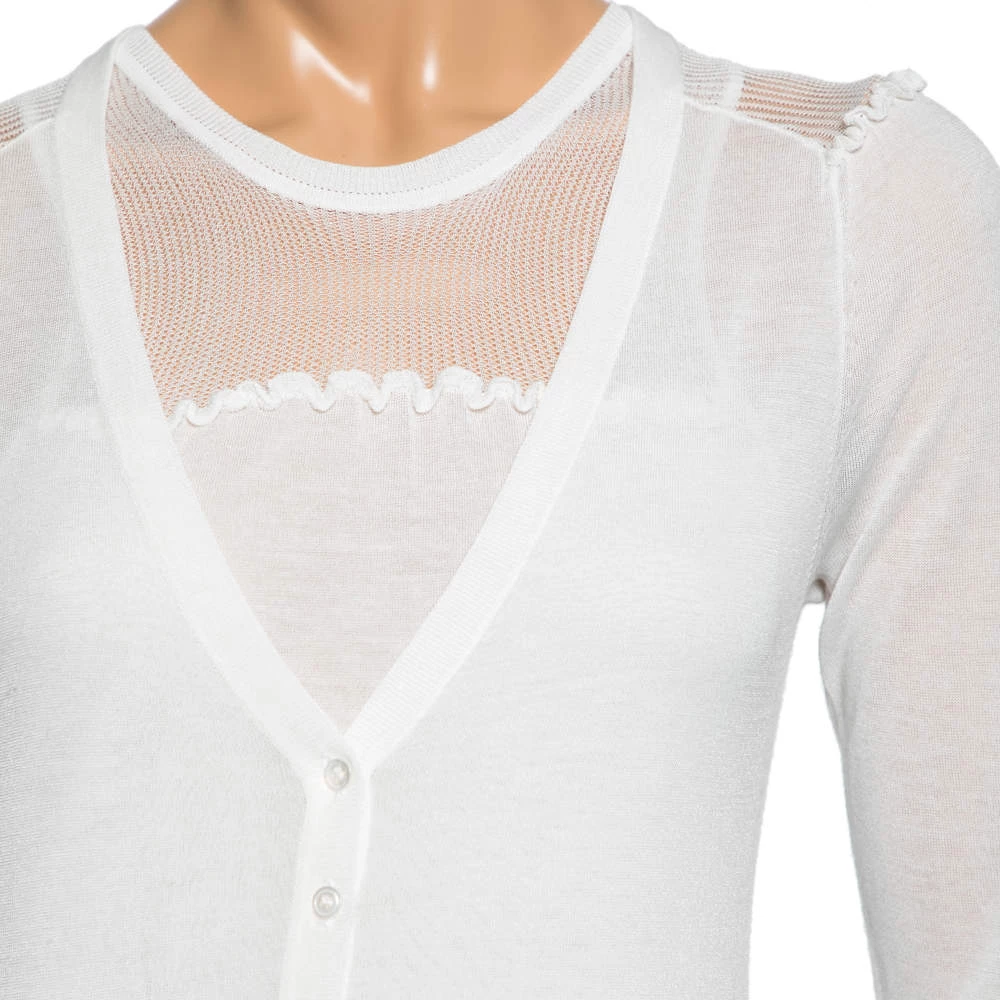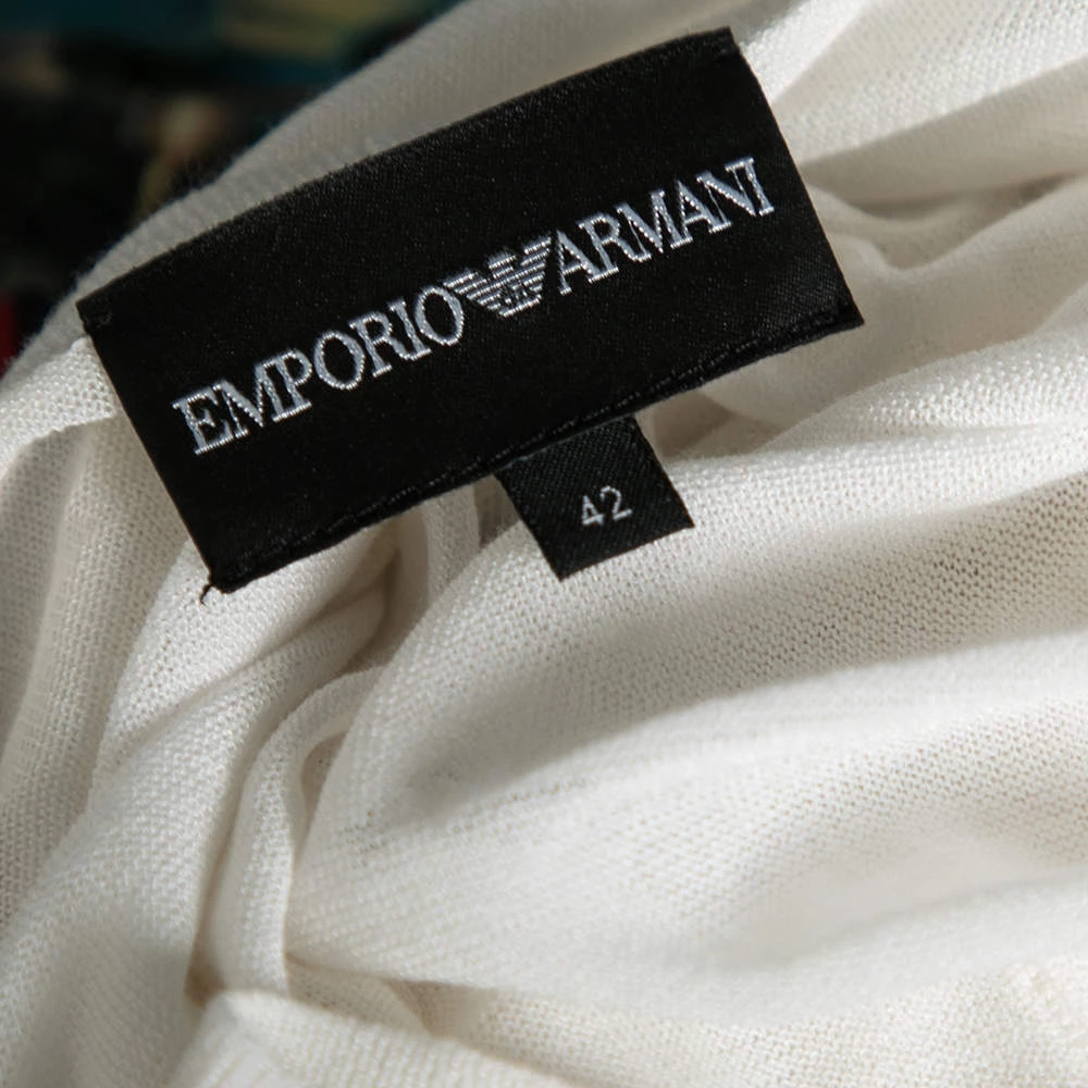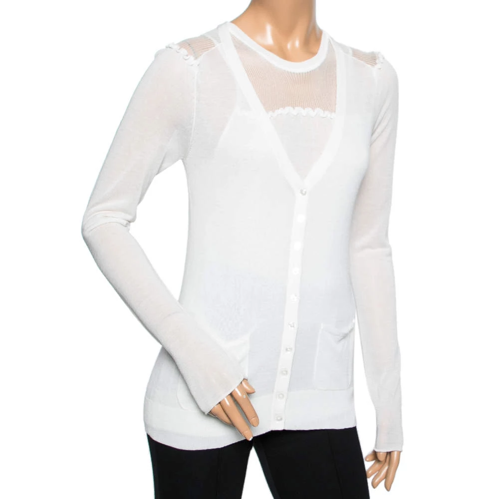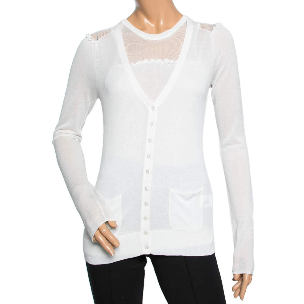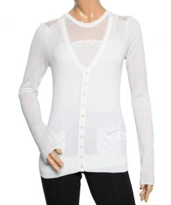 This cardigan and top set from the House of Emporio Armani will be your best pick for the winter! This set is stitched using off-white knit fabric. The cardigan displays a button-front feature and long sleeves, while the top has a sleeveless style. This set has two pockets in total.