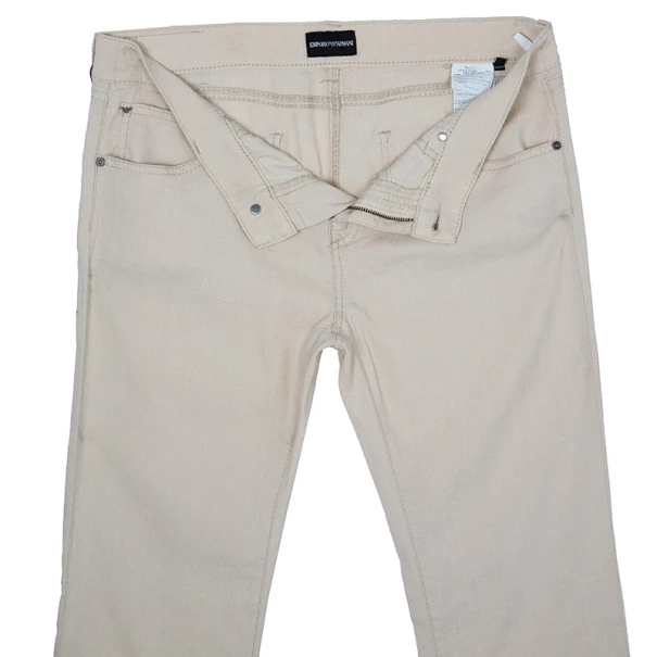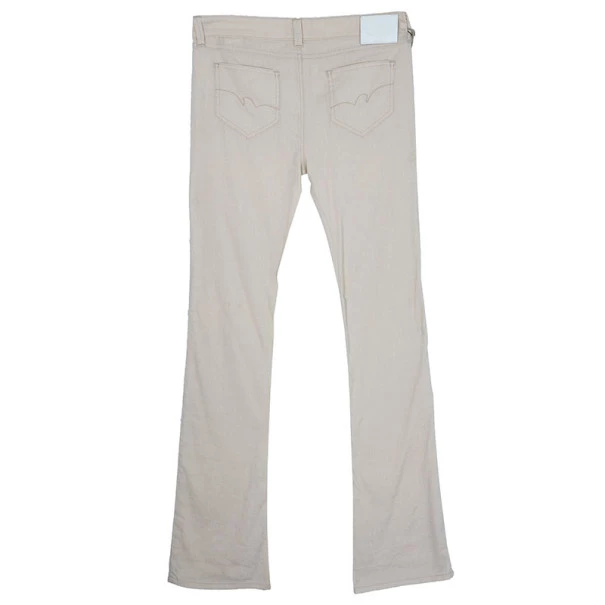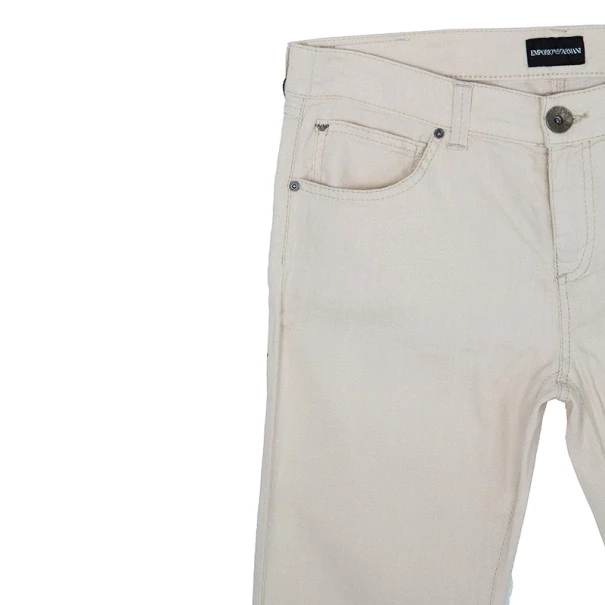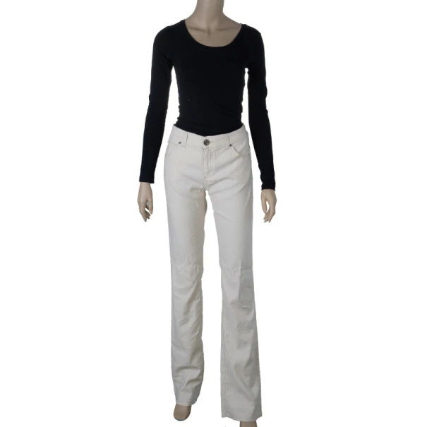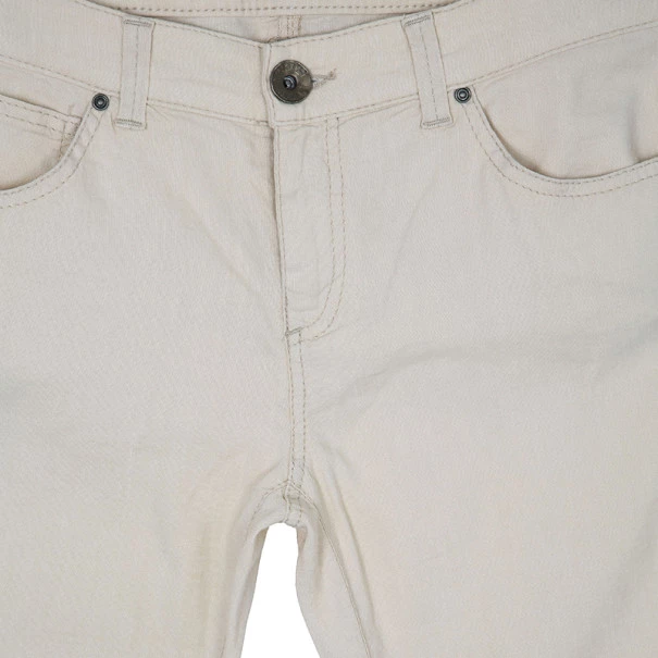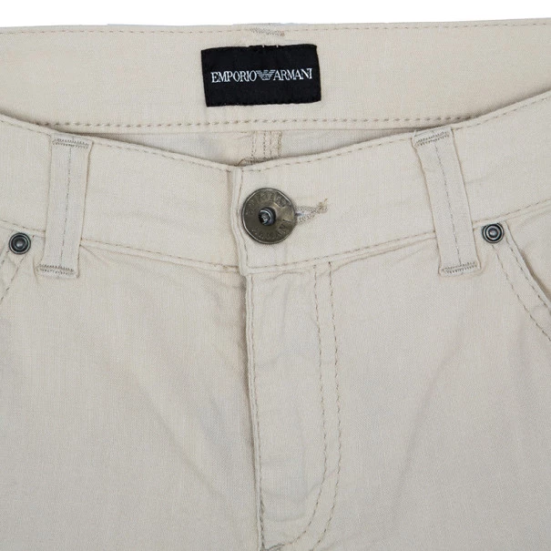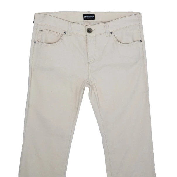 A beautiful off-white color, these Emporio Armani trousers will give your day a classic touch. Its linen blend exterior is designed with small flares at the bottom, dark bronze studs, a button closure, coupled with belt loops, front pockets, and two back pockets.Original Retail Price: USÂ $338