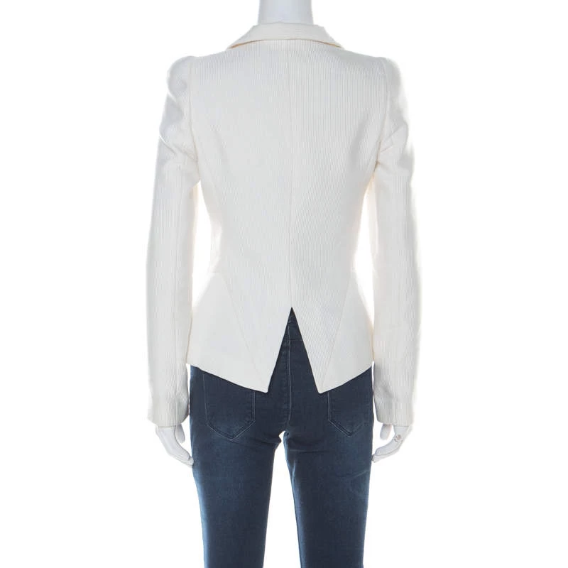 Gorgeous and comfortable, this blazer from Emporio Armani will make others nod in admiration. The fabulous off-white blazer is tailored from quality fabrics, and it features front buttons and ribbed textures all over.