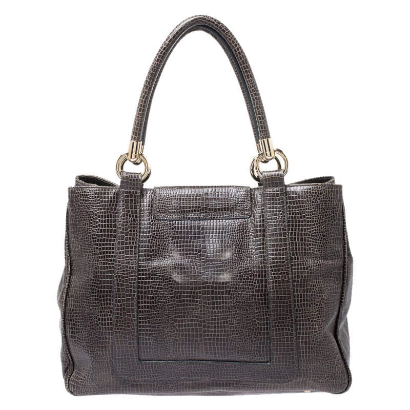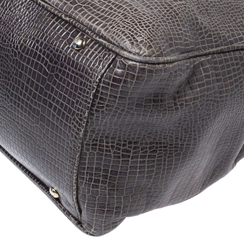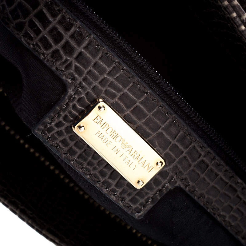 This bag by Emporio Armani has been crafted from crocodile-embossed leather. It comes in a lovely shade of olive green that enhances the patina of the exterior. It flaunts an exterior front pocket, dual handles, brand plaque, nylon interior with a zip compartment and open compartment. It is finished with gold-tone hardware and protective metal feet.