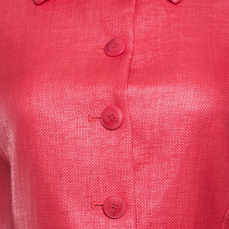 Craft your impeccable formal style in this Emporio Armani blazer. Designed in a peplum shape, this elegant creation flaunts a recognised collar with a buttoned closure and long sleeves. The perfect fitting of this textured pink blazer promise a striking corporate look.