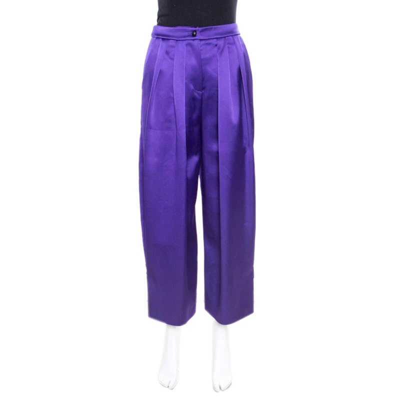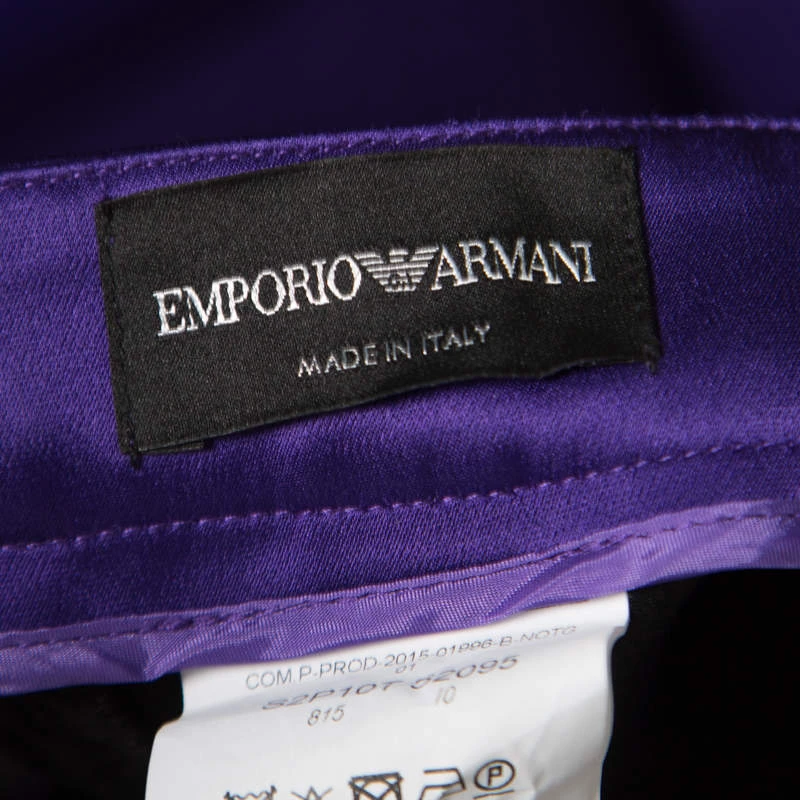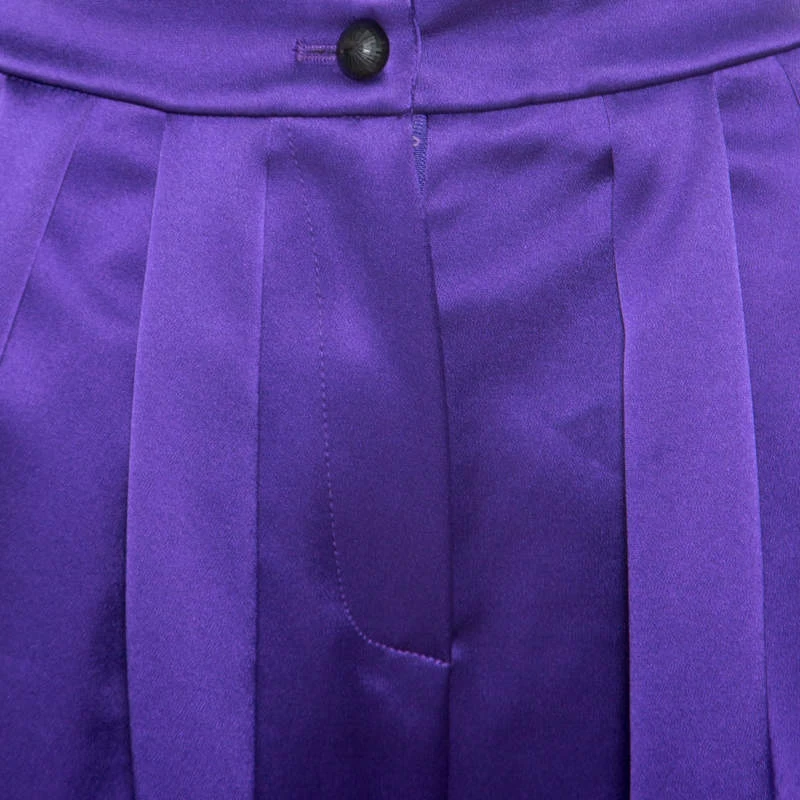 Ethereal and exquisite, these purple Emporio Armani pants will surely make you stand out! The satin pants feature pleats and flaunt a wide leg silhouette. They come equipped with a front button fastening and three pockets. They are sure to lend you a great fit and can be paired with an asymmetrical top and pointed pumps for a special occasion.