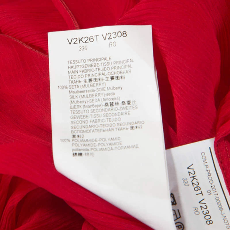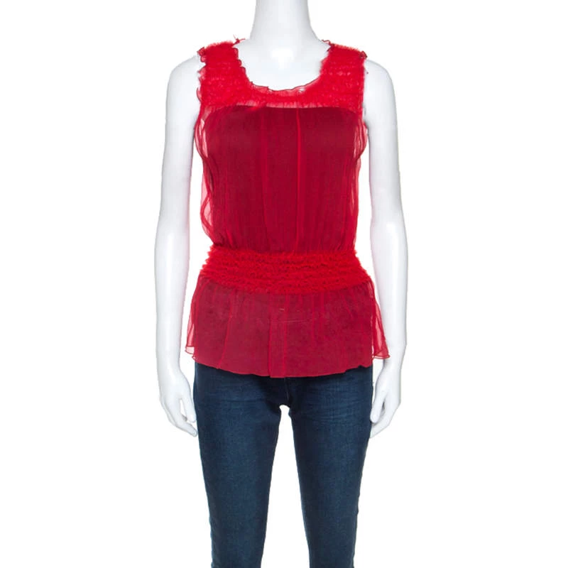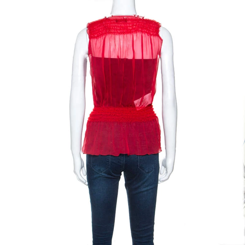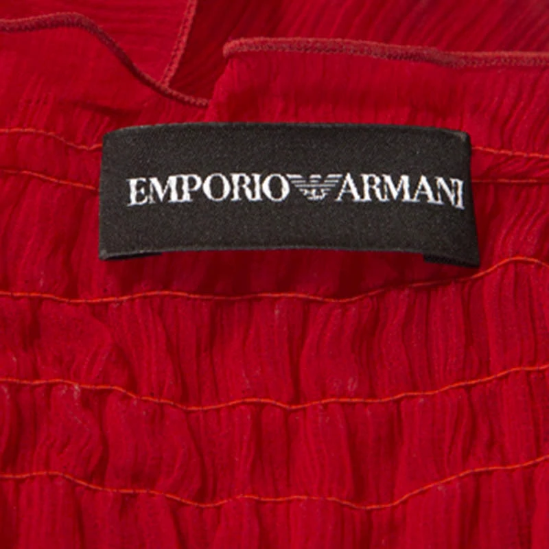 This Emporio Armani top is a celebration of classic aesthetics and easy fashion. This sleeveless top features elasticized ruffle details and a sheer design. This red silk top is a minimalistic everyday wear essential perfect for you.