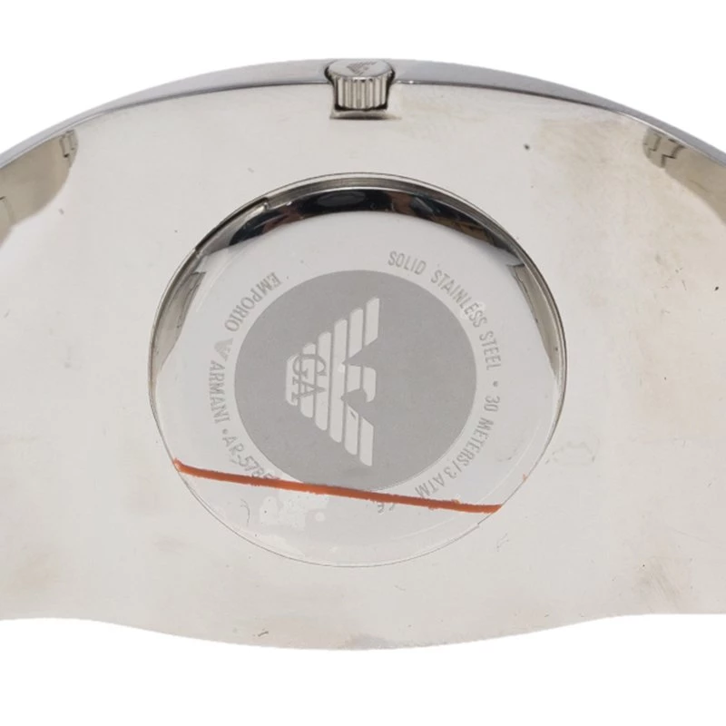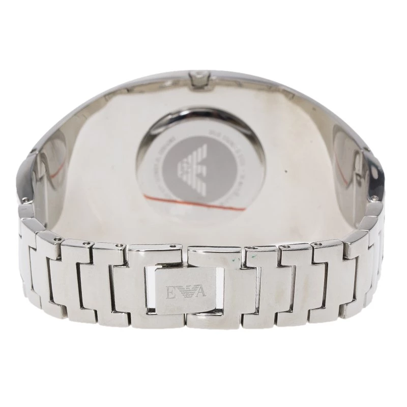 Emporio Armani wristwatch is designed in an ultra-stylish cuff pattern. The stainless steel body features silver etched logo all over and small rounded white dial. It is finished with a deployment type closure. Make a statement with this watch by wearing it with smart casual attires.