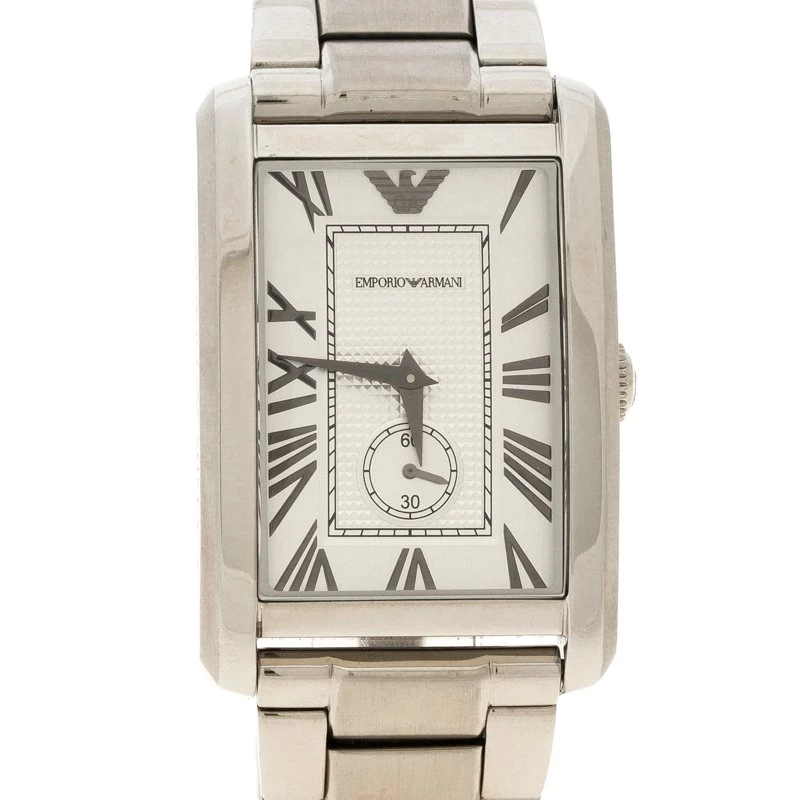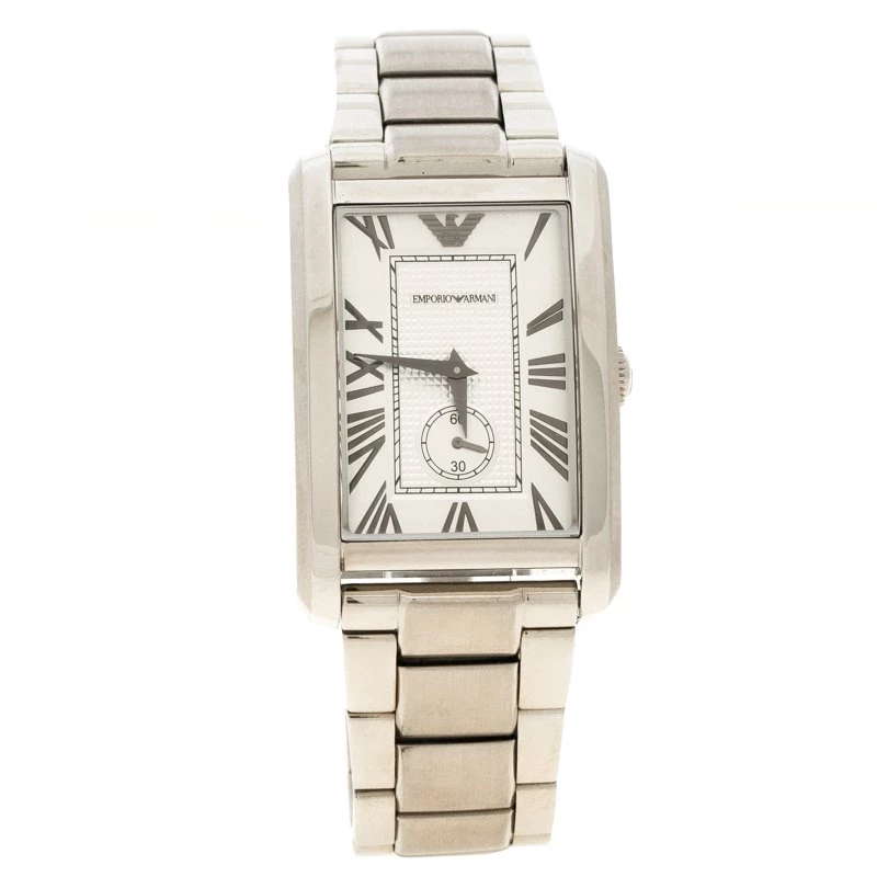 Be a proud owner of this Emporio Armani timepiece that has been crafted from stainless steel. Swiss made, the watch has a silver dial with Roman numerals for hour markers and the brand logo at the 12 o’clock position. It has a solid case back and is complete with a seconds dial and a deployment clasp that has a push button.