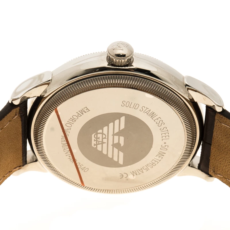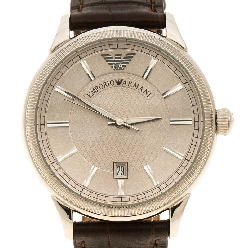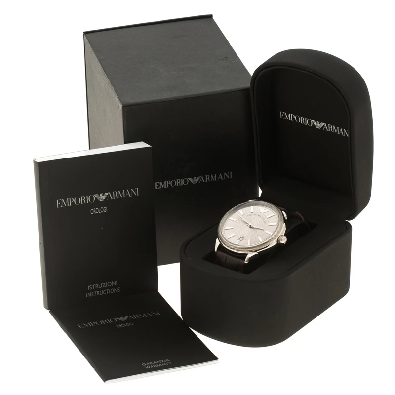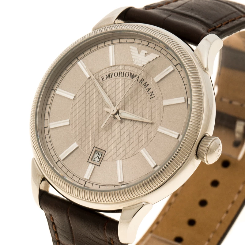 Flaunt this timepiece from Emporio Armani on your wrist by owning it today. Crafted from stainless steel and held by a leather bracelet, the watch follows a quartz movement. It has a silver dial with index hour markers and a date window at the 6 o’clock position. The Swiss made watch has a water resistance of 50 meters and is complete with a buckle clasp.