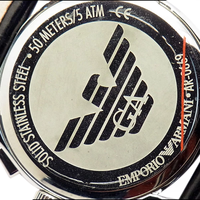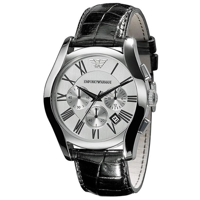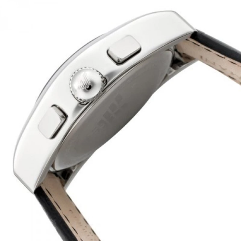 This timepiece is a unique creation for the modern men. Crafted from stainless steel, it features a round stainless steel case with a silver dial. It comes with sleek black hands, Roman numerals and a sub dial enabling its chronograph capabilities. The Emporio Armani logo speaks volumes of the quality craftsmanship that has gone into making this exclusive watch. This 50m resistant watch fixes on a wrist with a black leather strap and a buckle closure.