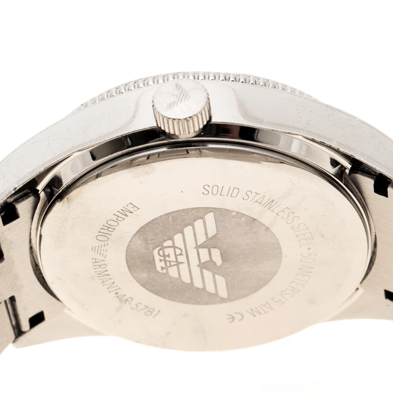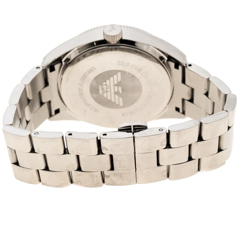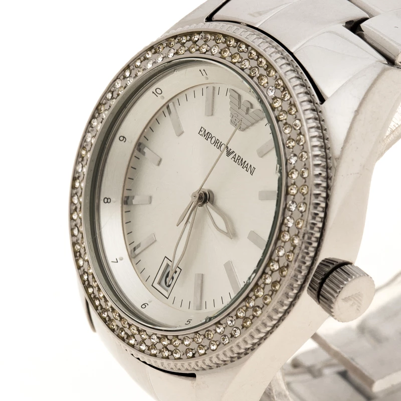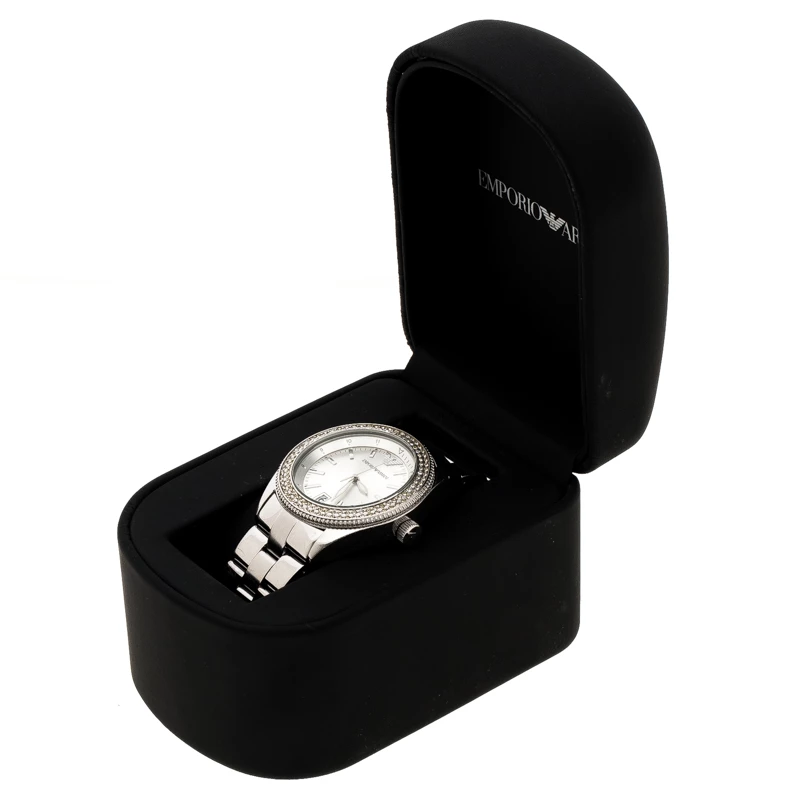 This Emporio Armani watch is every bit glam. It features a silver stainless steel body with a case diameter of 39mm. The rounded dial features silver-tone hands and markers and surrounded with a diamond embedded bezel. Powered by quartz movement, this piece is secured with a deployment closure and looks best when styled for celebratory occasions.