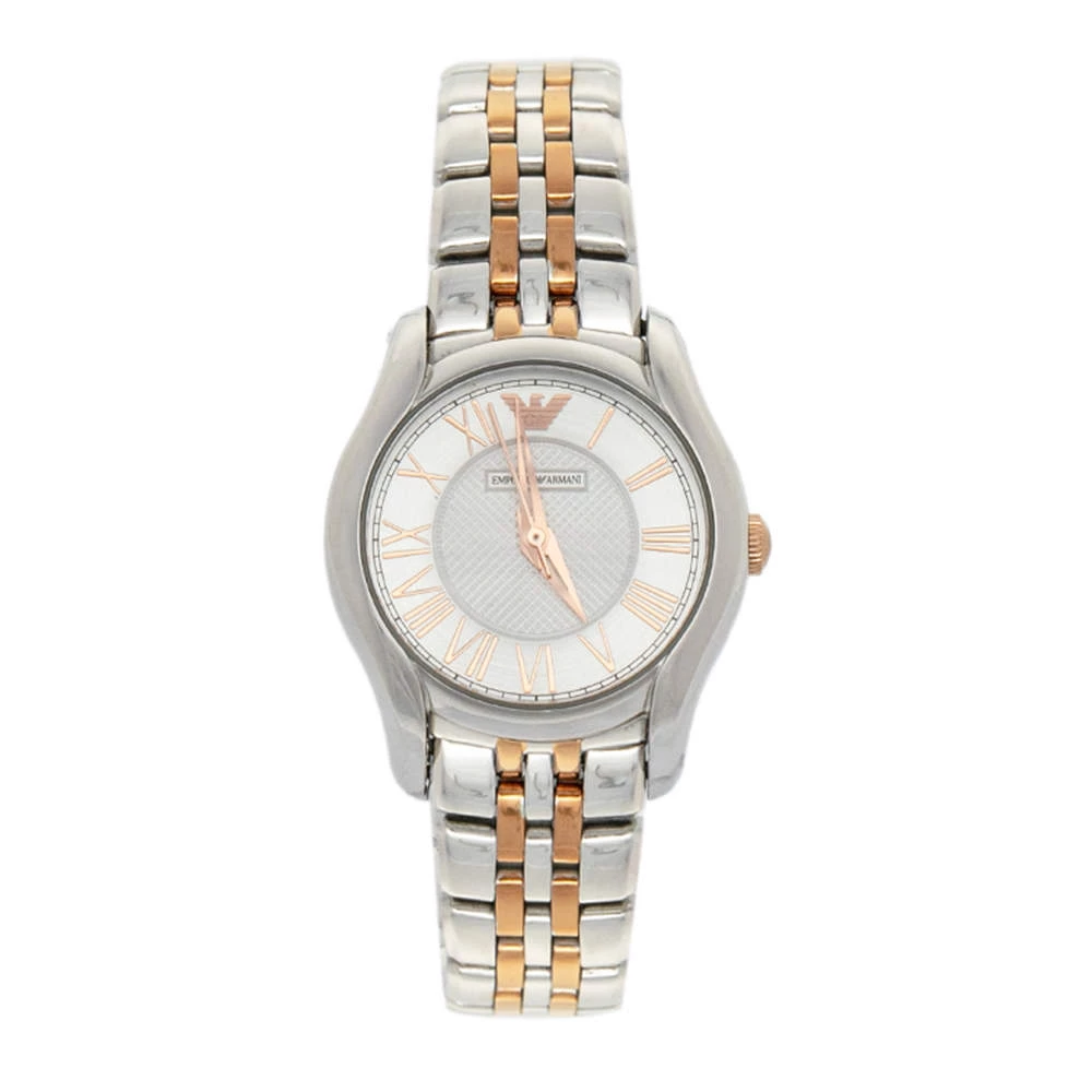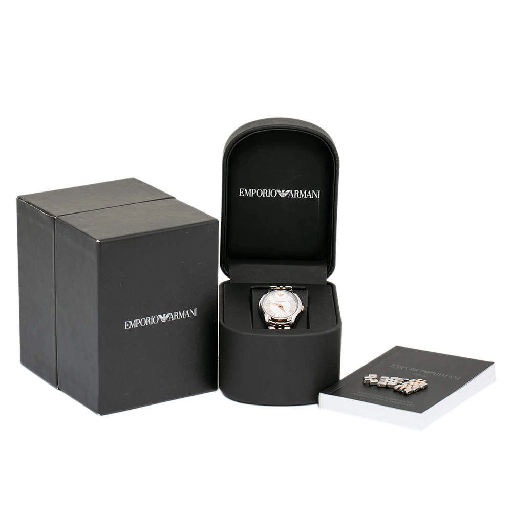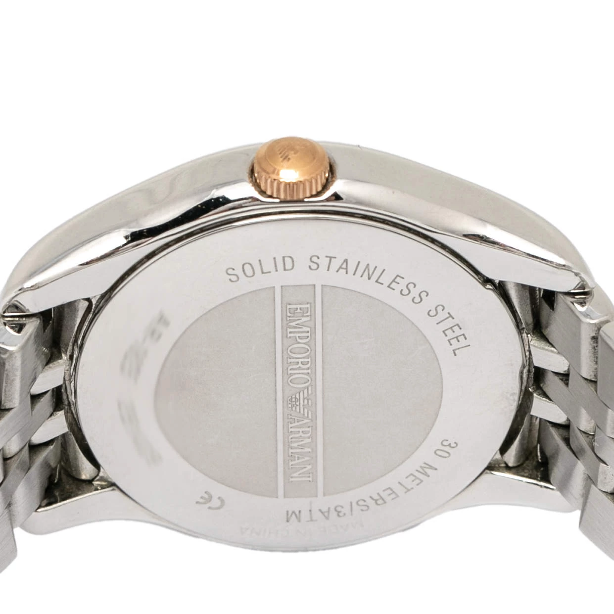 Built to assist you every day, this Emporio Armani wristwatch comes made from two-tone stainless steel. The quartz watch features gold-tone markers, three hands, and brand detail on the dial. It is water-resistant up to 30 meters and is secured by a simple clasp.