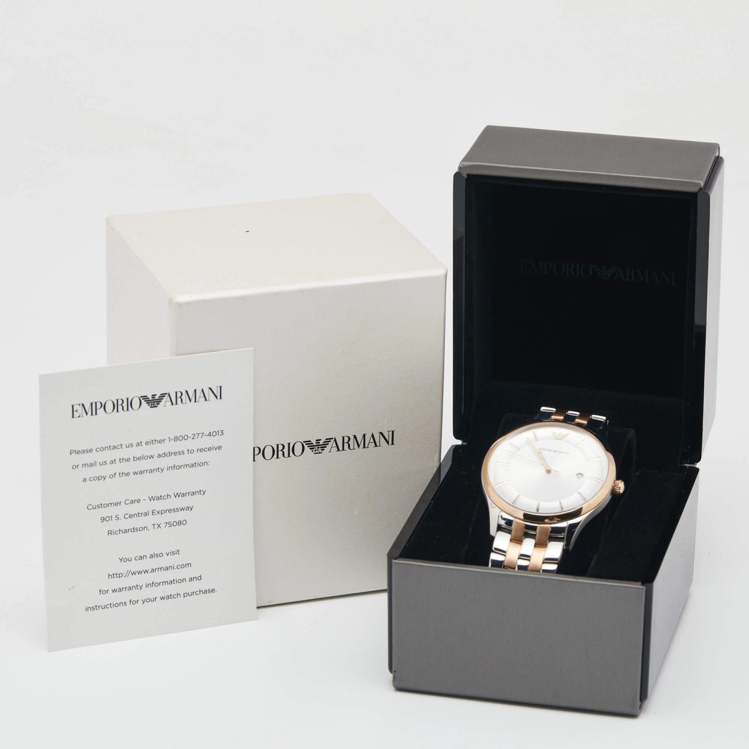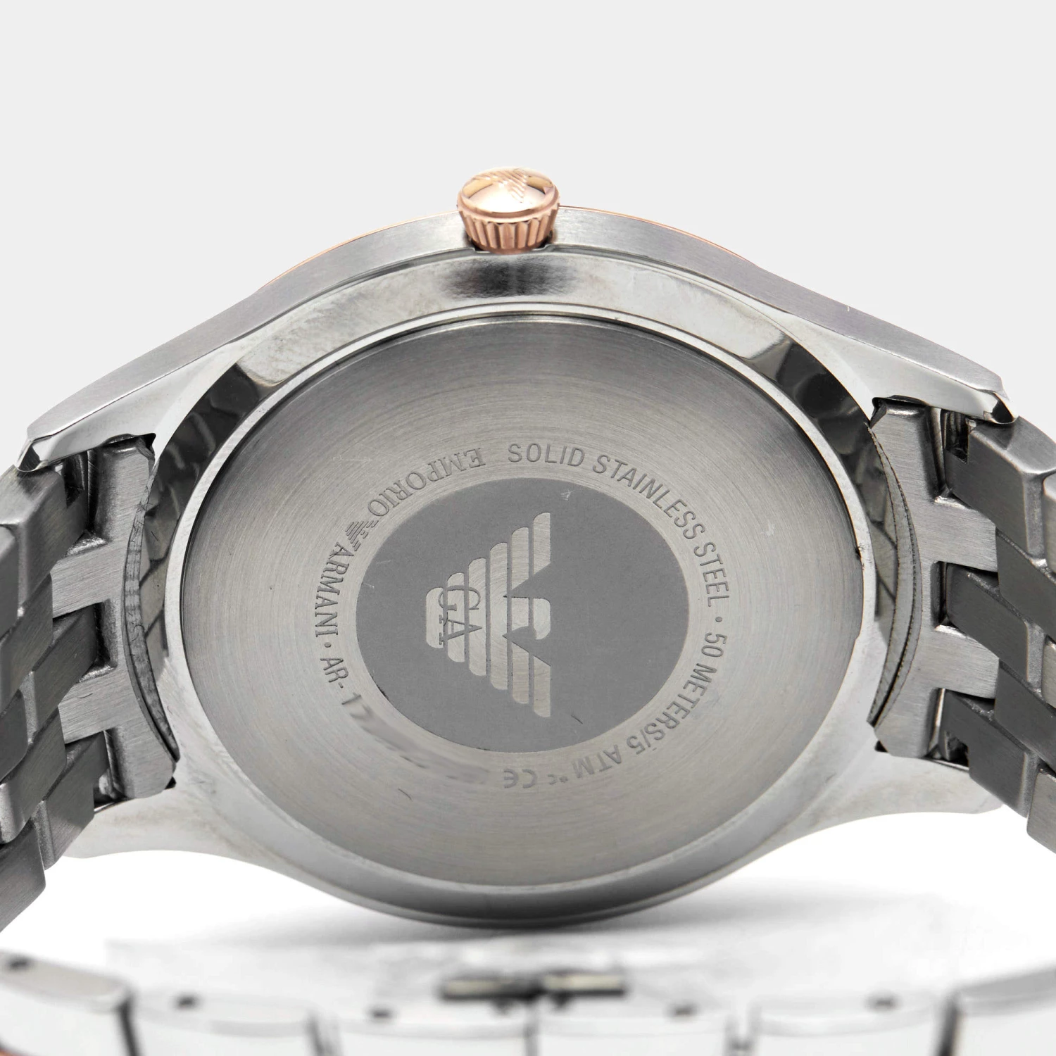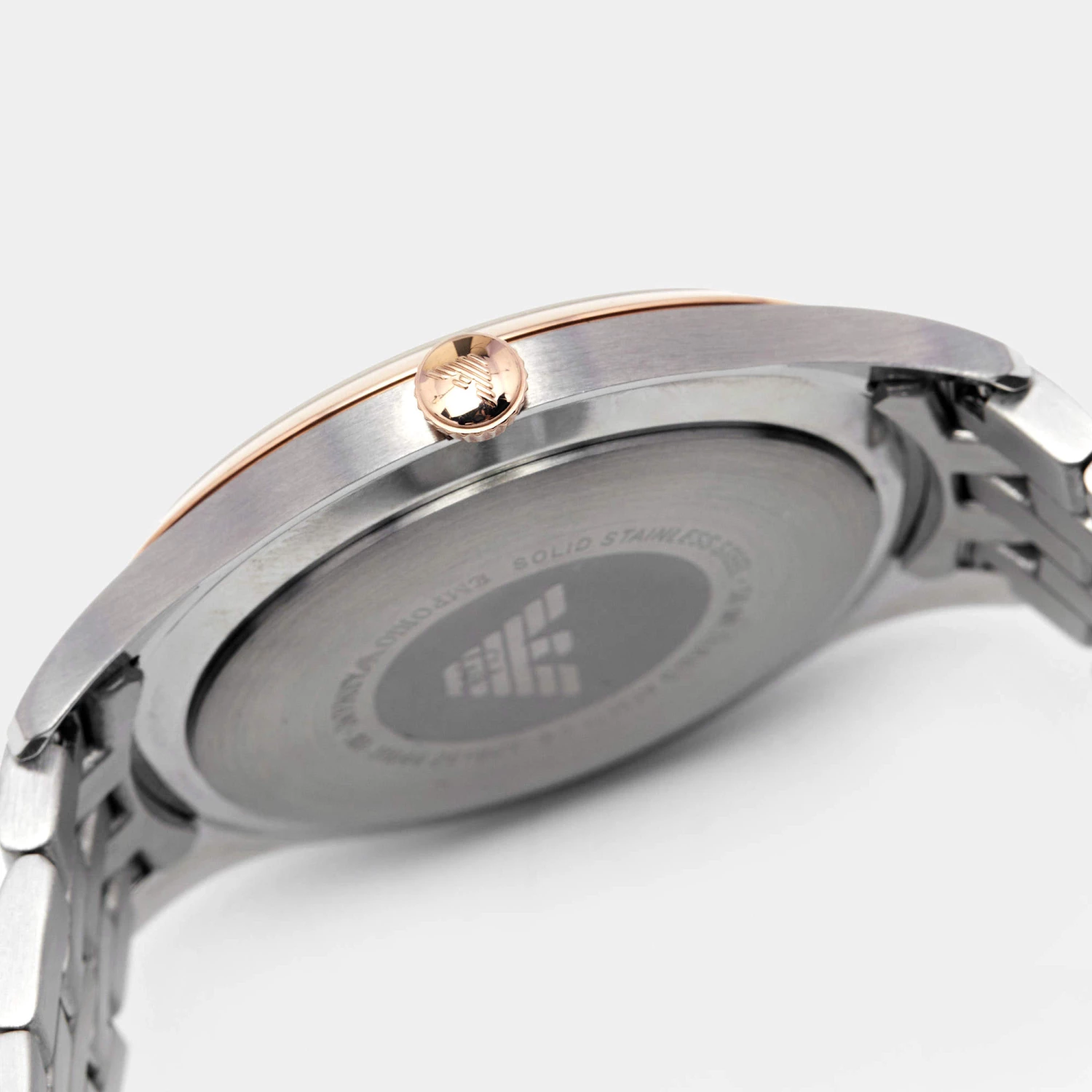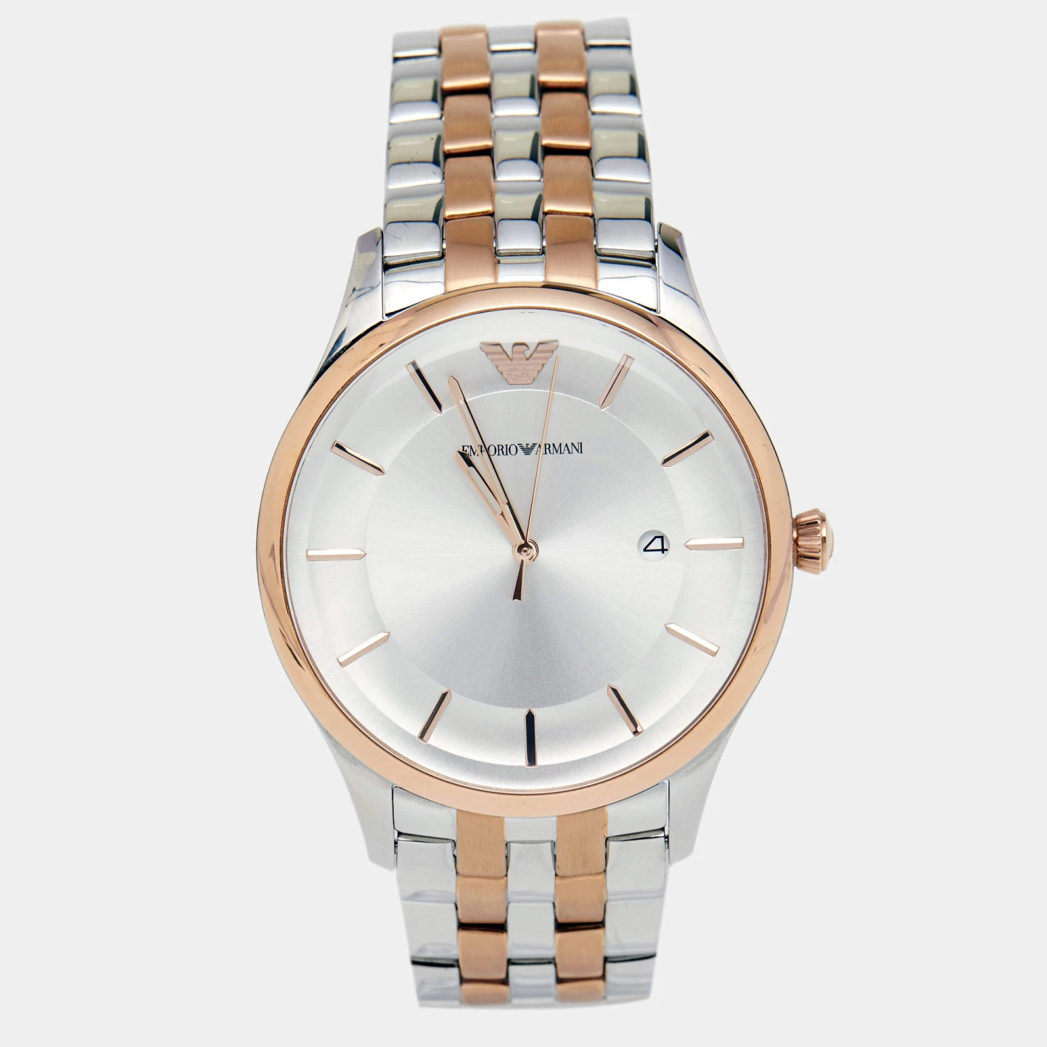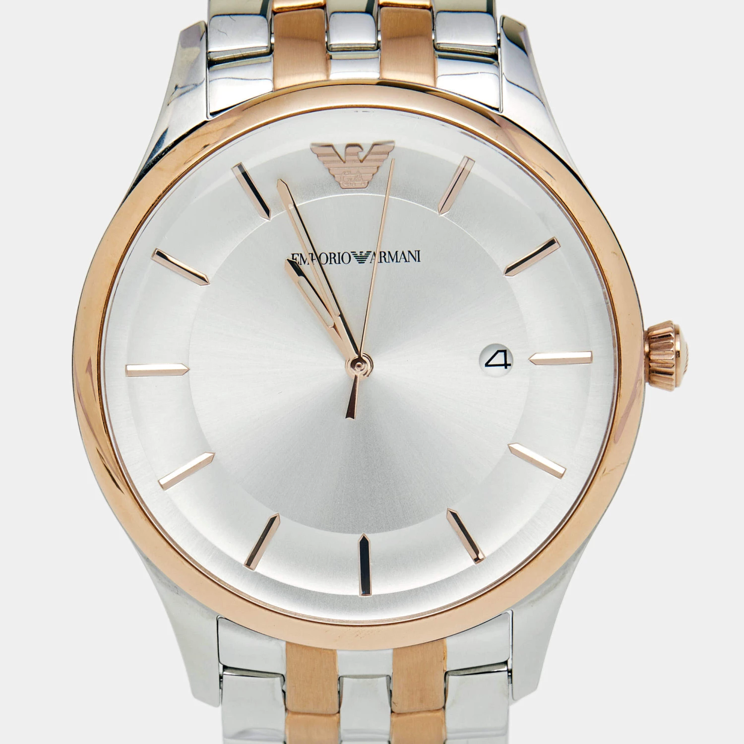 A timepiece for everyday wear, this beauty by Emporio Armani is made to tell the time in the most efficient way. The watch is made of two-tone stainless steel and it has a silver dial set with gold-tone hour markers, three hands, and a date window.