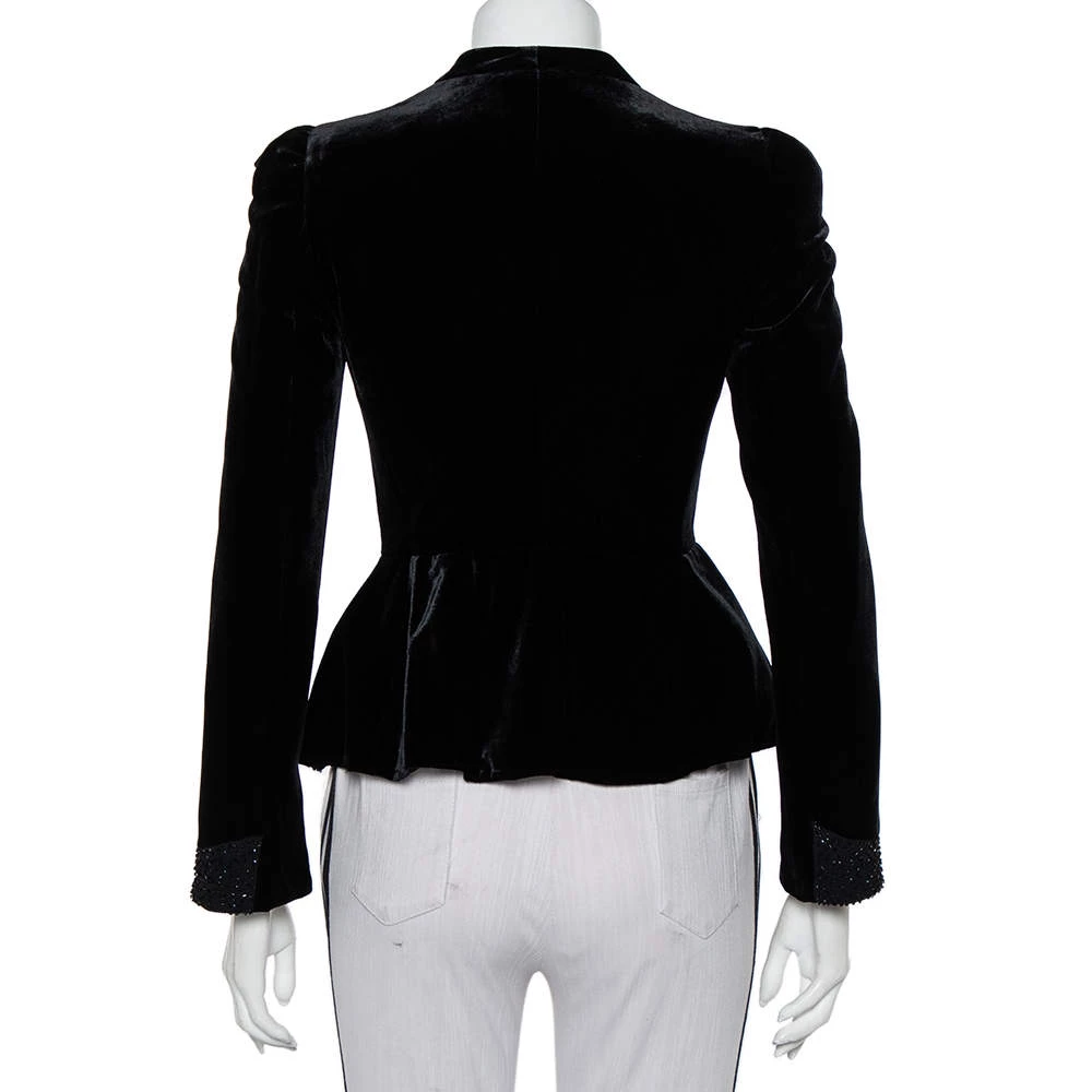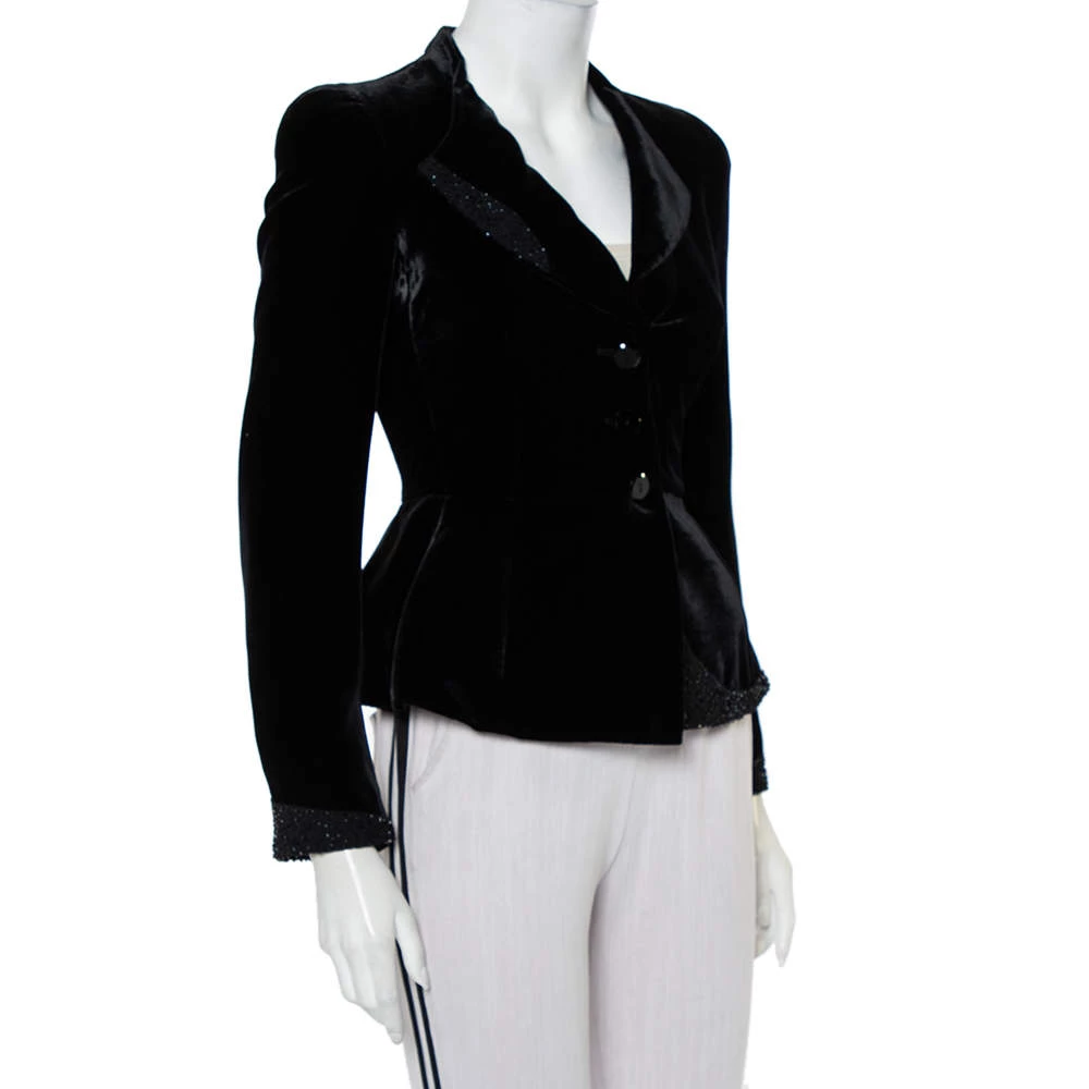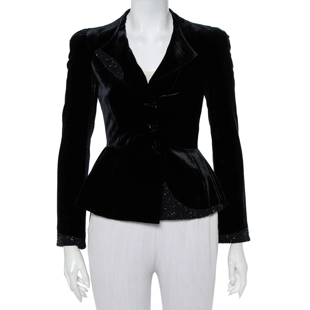 This elegant blazer from Emporio Armani is sure to make you look your best from every angle. The black blazer for women is made of velvet and features button closure on the front, subtle embellishments, and long sleeves.