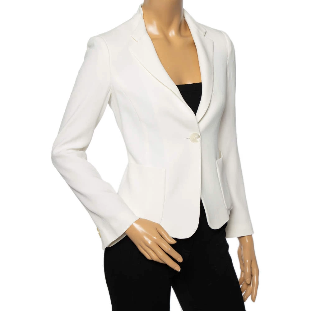 Enhance your formal wear by adding this blazer to your collection. This blazer from Emporio Armani is tailored using white crepe fabric, adding a touch of finesse and femininity to its appearance. It is made in a single-breasted style and comes with two pockets. Complement this blazer by matching it with sleek trousers and pumps.