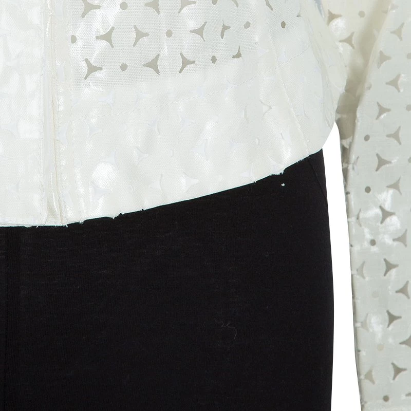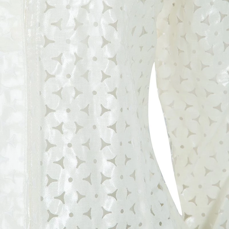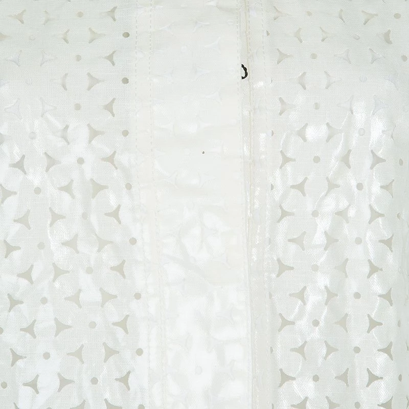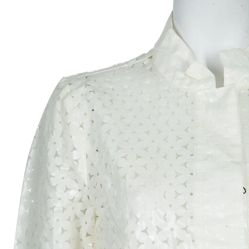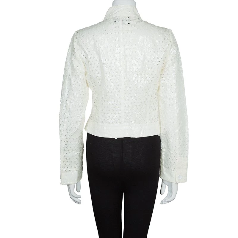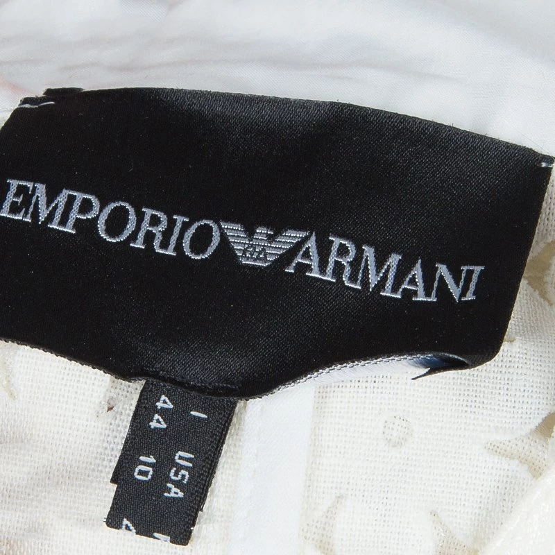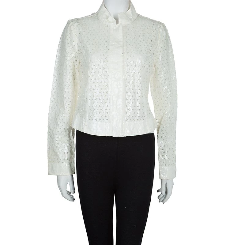 Handpicked from the Emporio Armani exquisite collection is the fashion essential with its exceptional styling and figurative contouring. The craftsmanship of laser cut has been designed over a blend of white cotton, linen, and polyurethane. Tailored in structured curves, the front and back have dart contouring with a collar band beginning from the banded collar to the broad hem of the jacket. Assemble this with fitted jeans and high stiletto heels for the quintessential glam appeal.