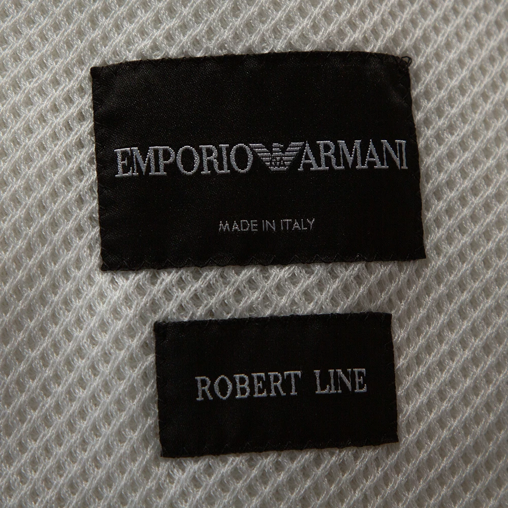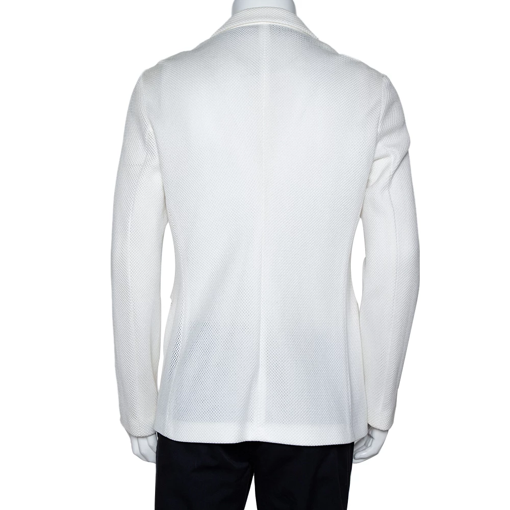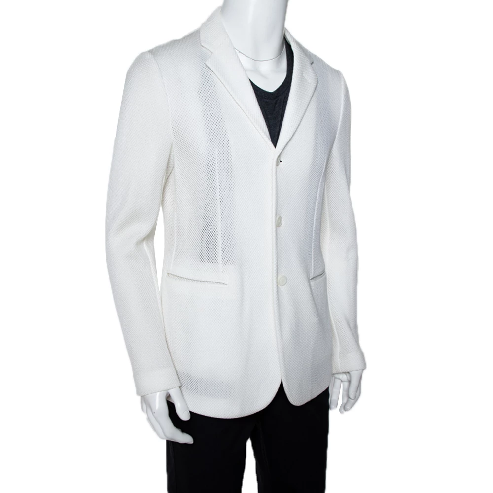 Add a touch of luxury to your look with this jacket from Emporio Armani. A well-tailored piece, this one is crafted with a cotton blend carrying a white mesh body and offering a slim fit. It has two buttoned closure with notched lapels and long sleeves. Layer this over a crisp shirt and tailored pants for a smart impact.