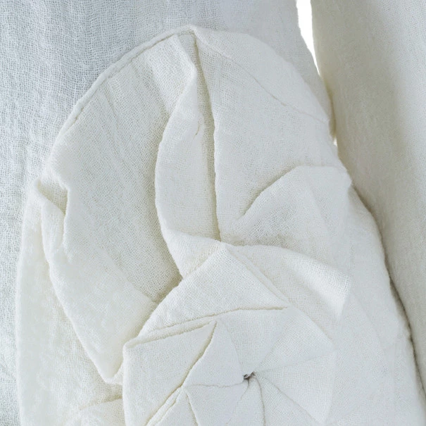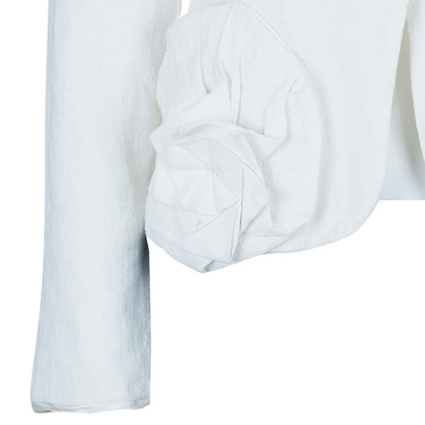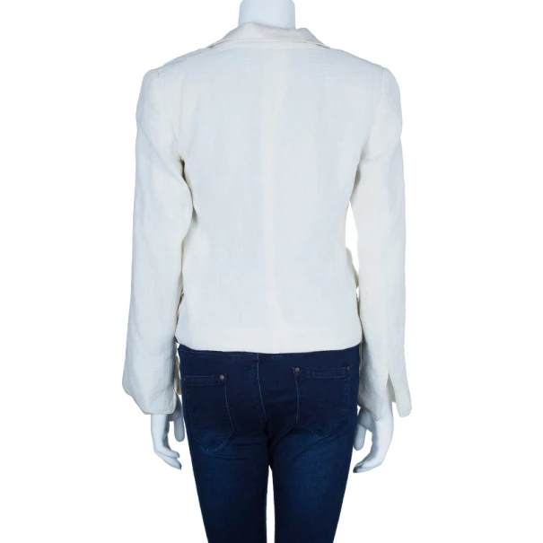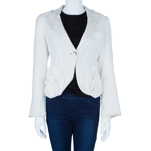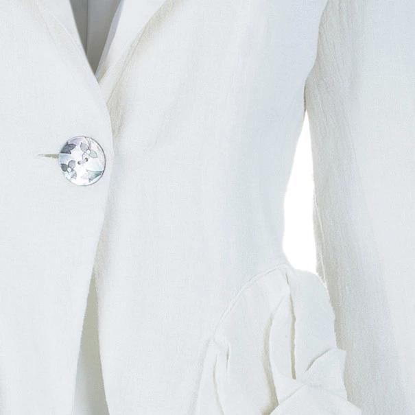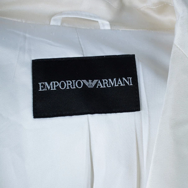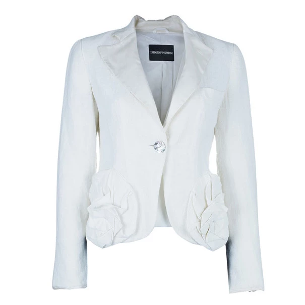 Add a touch of style to your look with this Emporio Armani white pocket detailed blazer. It will go perfectly with a black pencil skirt or some trousers. It features a lapel collar, a button fastening in the front and two front pockets with ruched fabric detailing.