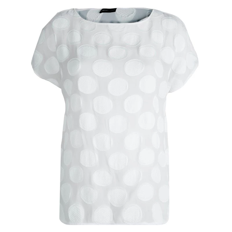 A modern take on the conventional polka dot pattern, this top from Emporio Armani plays white on white. Large white polka dots are featured on a subtly sheer body. It features a simple neck and short sleeves. Made from chiffon, it is lightweight and comfortable to wear.