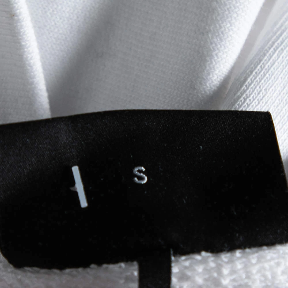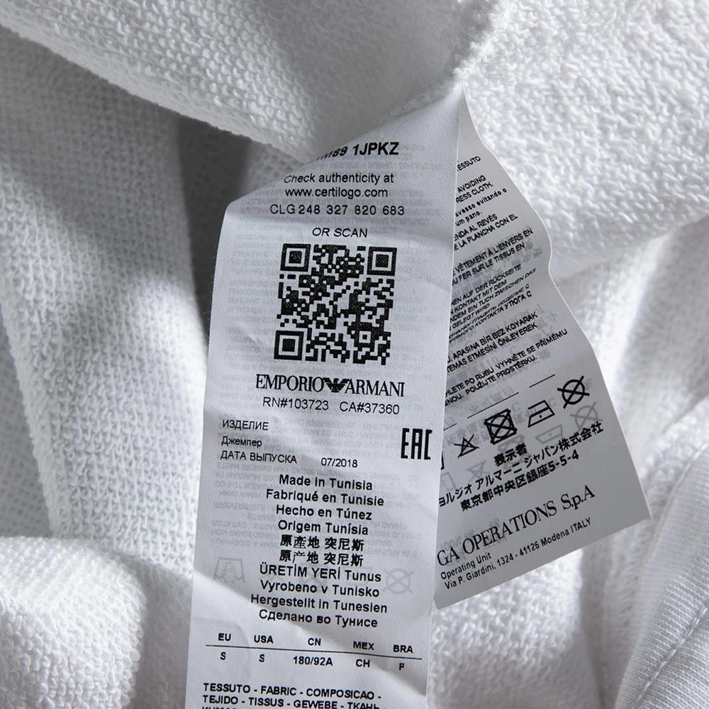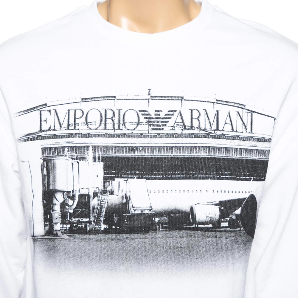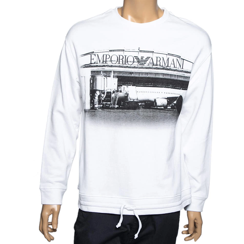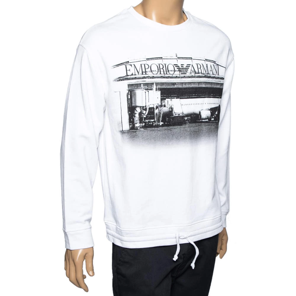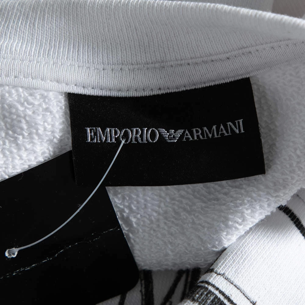 Spend your days in comfort and warmth with this Emporio Armani sweatshirt. Crafted from cotton knit, the white creation is elevated with an aesthetically pleasing print and features a crew neckline and long sleeves. The tie detail at the finely tailored hem completes the design.