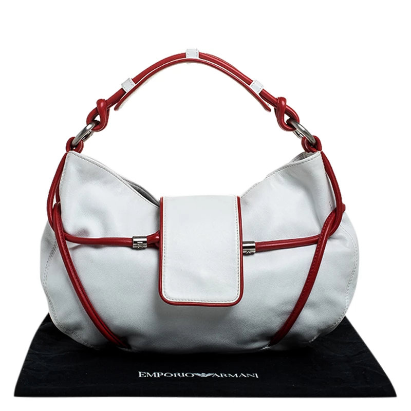 A good pick for everyday use, this pleasing white bag is from Emporio Armani. The bag is crafted from leather and lined with fabric. It is enhanced by red leather trims, a red handle and a bow-like detail forming at the top when the strap secures the bag.