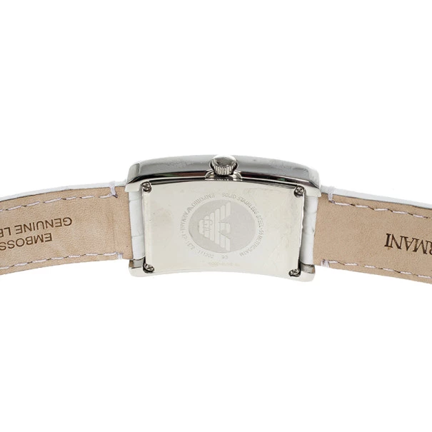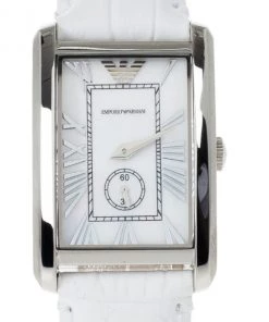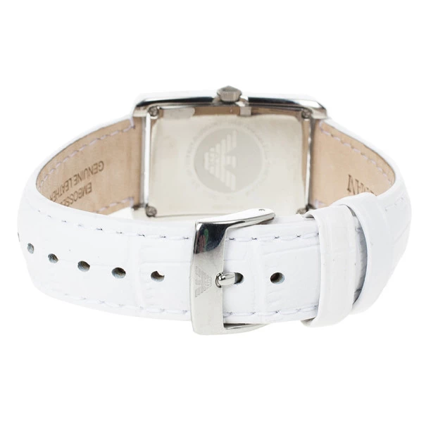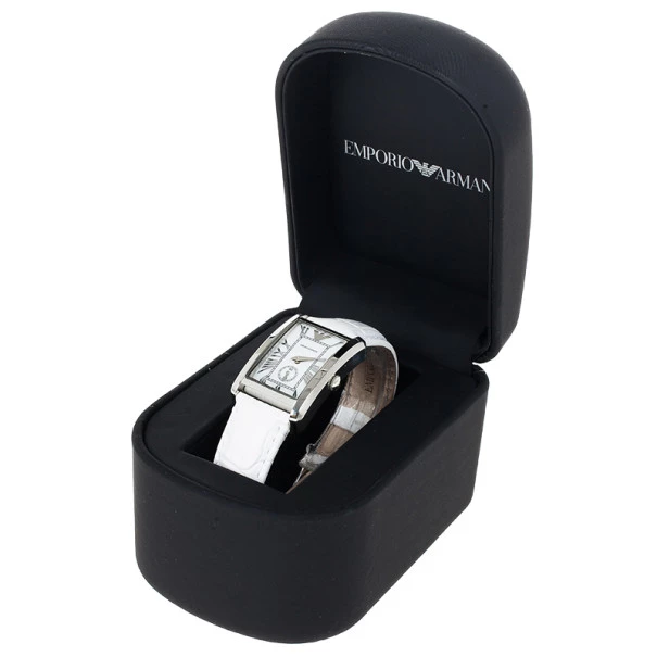 Crafted with a clean and dainty look, this Emporio Armani watch combines the classic colors of a stainless steel case and an embossed white leather band, giving it a classy look. Its white dial is decorated with silver Roman numerals, pointed hands, and the eagle logo at 12 o’clock. It features a minute chronogarph matched with black minute indicators. This watch has a clasp closure and a 50M water resistance level.Original Retail Price: US $270Gender: WomenCondition: New (This item has never been used)Case Diameter: 20 MMMovement Type: QuartzBracelet Material: LeatherCase Material: Stainless SteelBracelet Length: 18 CMIncludes: Original Box