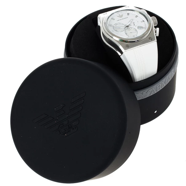 Add some boldness to your look with this Emporio Armani wristwatch. Designed with a dark silver stainless steel case, it is decorated with screw motifs and bulky adjustments. Its white dial is matched with a white rubber band and an engraved buckle closure. It has oversized white hands with silver outlines, with a white seconds hands and grey second, minute, and hour indicators. The complications featured in this watch include second, minute, and hours chronographs, in addition to a date window. This watch has a 50M water resistance level.Original Retail Price: US $670Gender: MenCondition: NewCase Diameter: 44 MMMovement Type: QuartzBracelet Material: RubberCase Material: Stainless SteelBracelet Length: 20 CMIncludes: Original Box